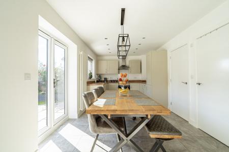 To the front of the property the living room with panelled feature wall leads into the modern kitchen diner complete with utility room. Modern units with integrated fridge freezer, south facing and bright with with double doors leading out to the landscaped rear garden. Additionally there is a utility room which houses plumbing for washing machine and space for tumble dryer and door into WC off the kitchen with opening into home office/boot room which is fitted with bespoke units, desk and cloaks area.