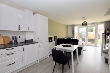 KITCHEN/DINING/LIVING ROOM 25' 4" x 13' 2" (7.72m x 4.01m) Dual aspect room with window to front and French doors to rear. Range of fitted wall and base units with worktops, fitted fridge/freezer, dishwasher and washing machine. Four ring gas hob with extractor over and electric double oven below. Stainless steel one and a half bowl sink and drainer. Stairs to first floor with cupboard below, recessed ceiling spotlights, laminate flooring, two radiators.