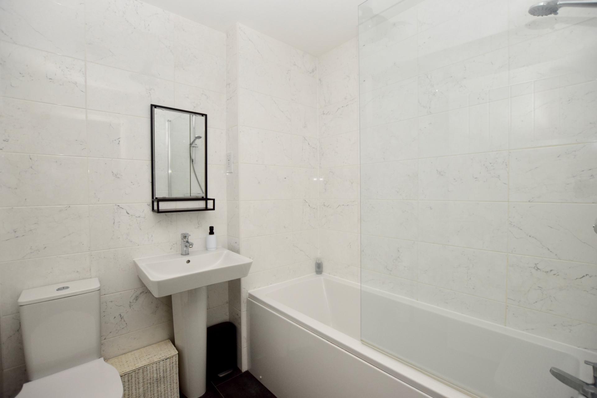 BATHROOM White suite comprising bath with shower over, WC and basin. Fully tiled walls, tiled flooring, extractor, white ladder style towel radiator.