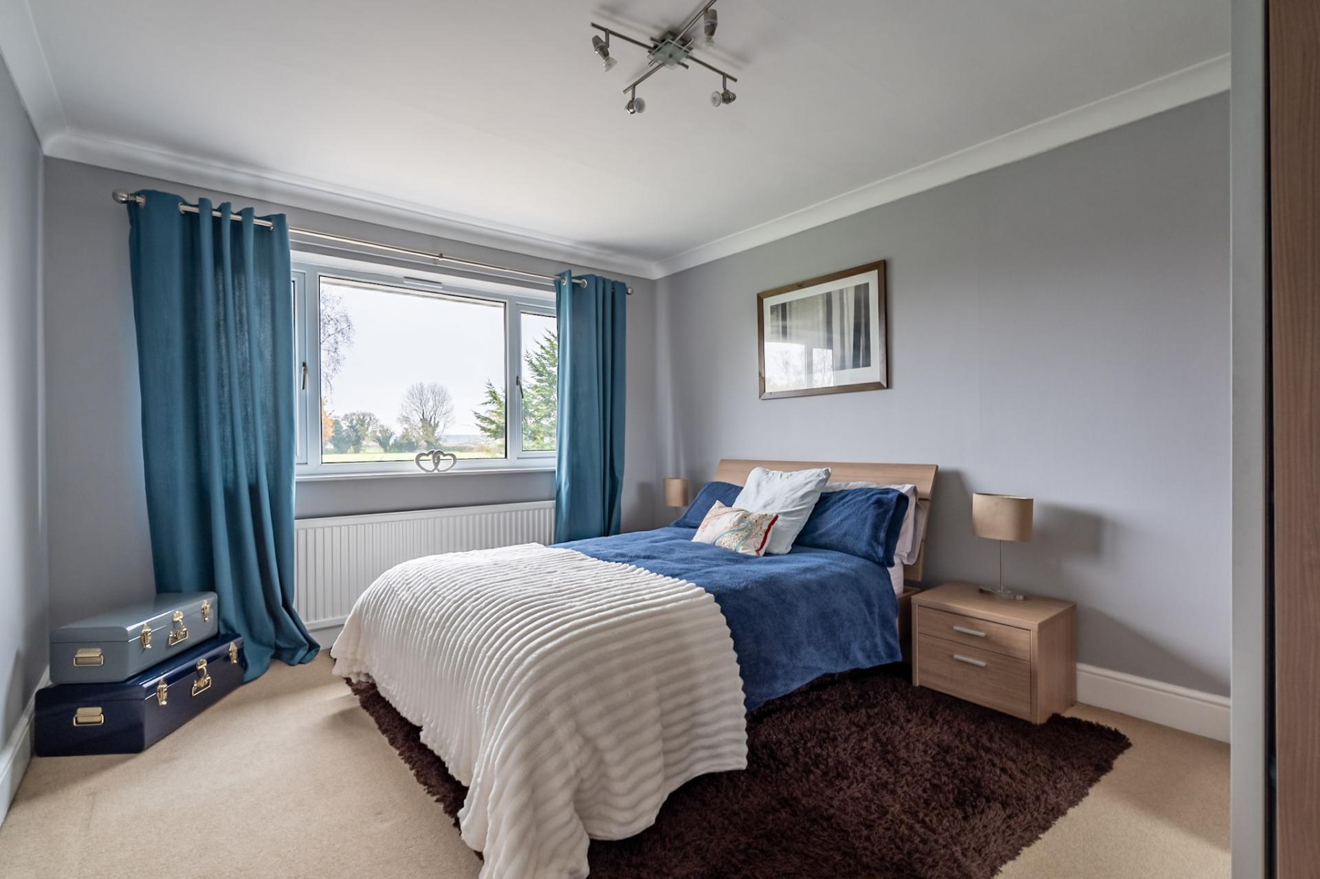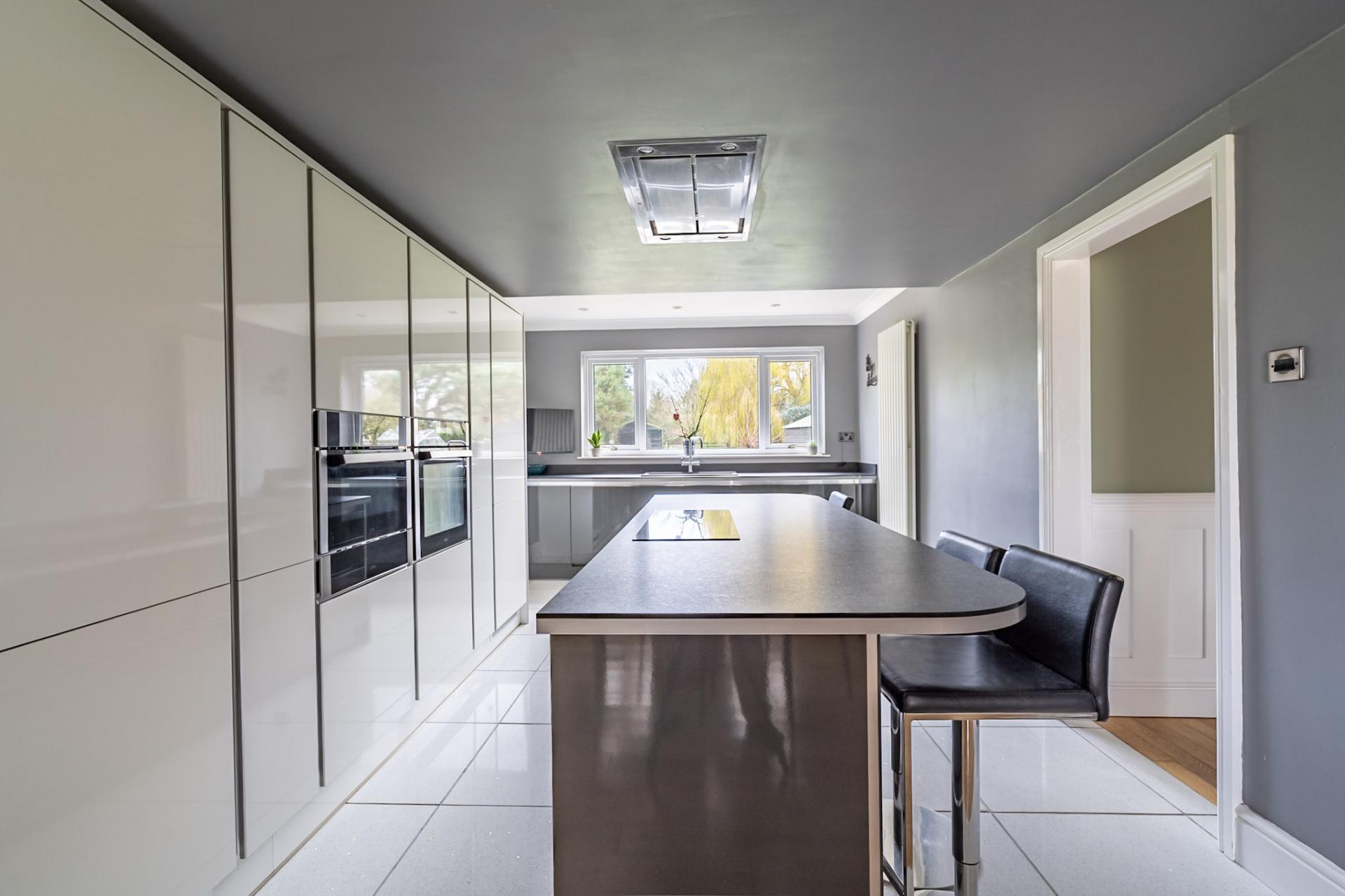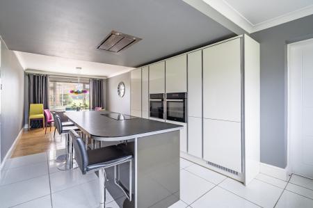 The modern kitchen–diner is fitted with a contemporary Wren kitchen comprising a full bank of wall units, integrated tall fridge and freezer, and a double eye-level oven. A central kitchen island provides further storage, breakfast bar seating, an induction hob, and a ceiling-mounted extractor. Additional base units house an integrated dishwasher, and the sink with boiling-water tap enjoys a pleasant outlook over the rear garden. The dining area is positioned to the front aspect with field views. A large utility room, with door onto the rear garden, offers further storage with a run of wall and base units and sink. Cupboard housing the floor mounted oil boiler, plumbing for a washing machine, and space for a tumble dryer. Completing the ground floor is a downstairs WC.