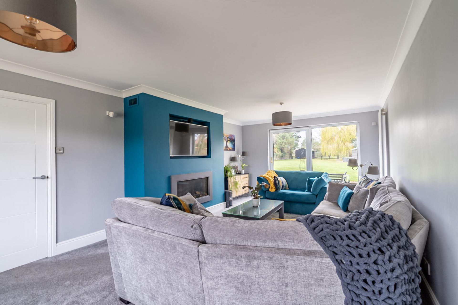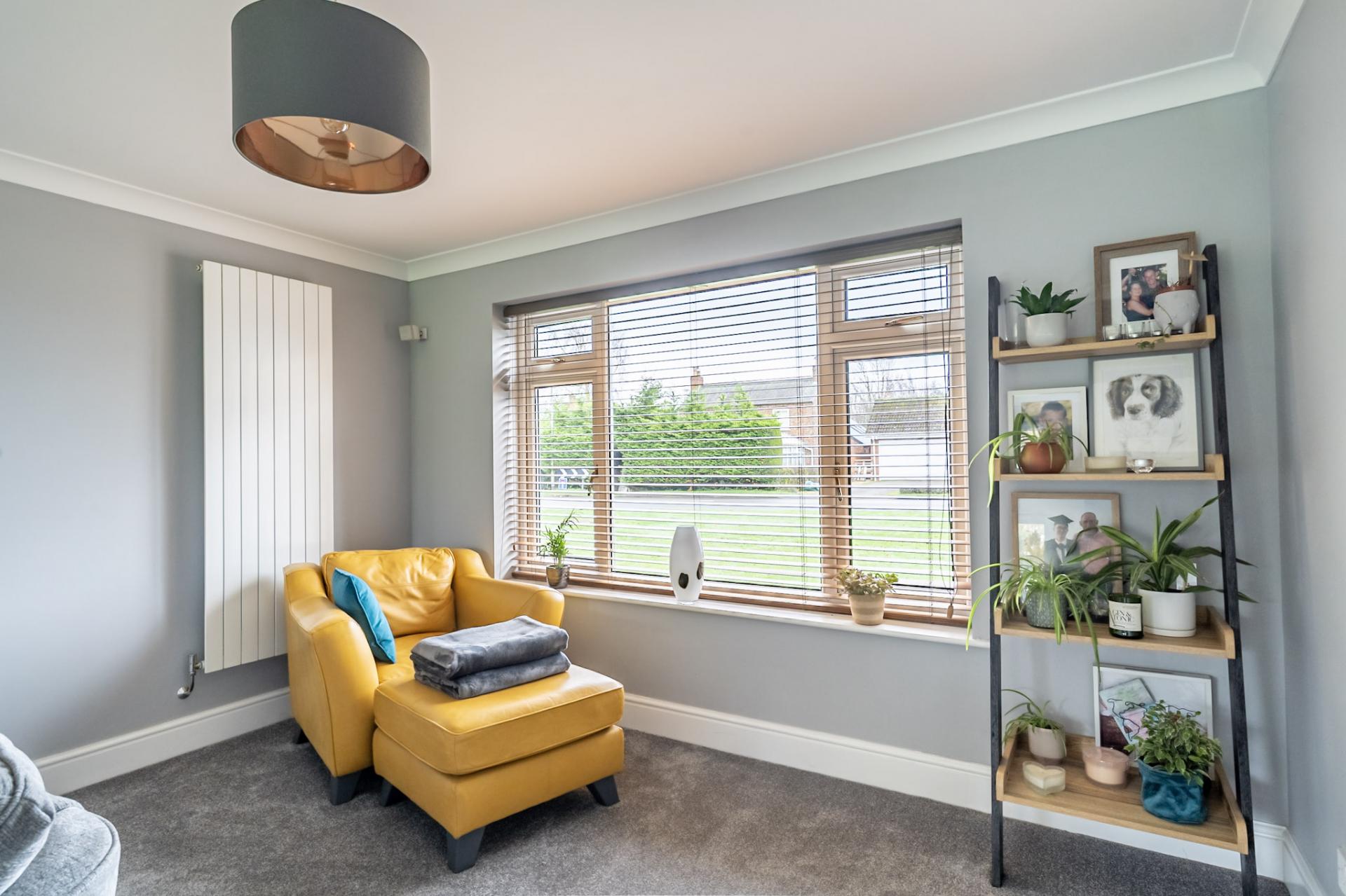 Originally built in the 1980s, the house offers spacious and well-balanced accommodation throughout. Enter through a porch with quarry-style tiles that opens into the sizeable entrance hall featuring wooden flooring and attractive panelled wall detailing. From here step into the dual-aspect sitting room which spans the length of the property, enjoying open views to both the front and rear, and includes a focal gas fireplace. There is also a versatile office/snug with views over the rear garden.