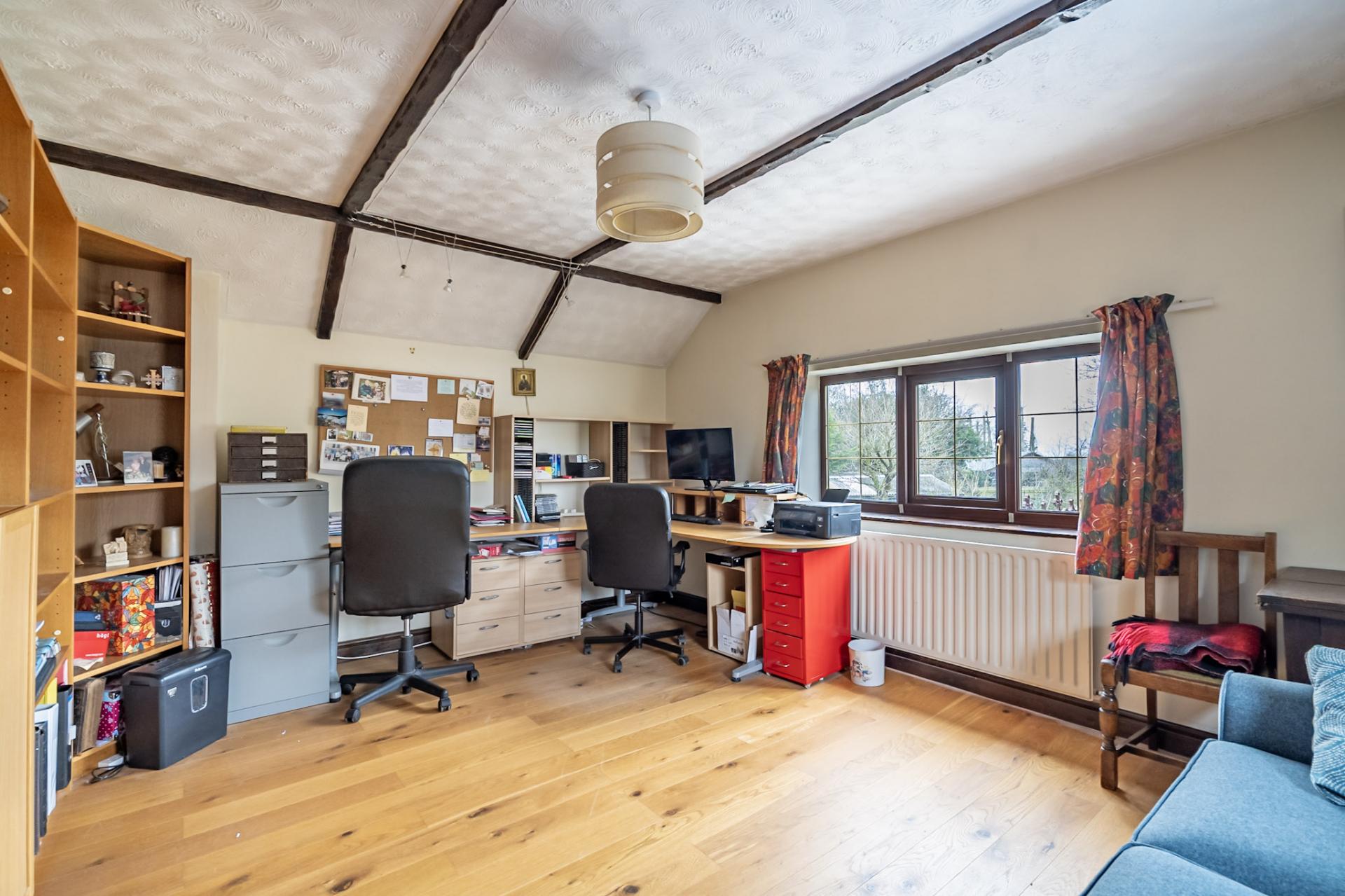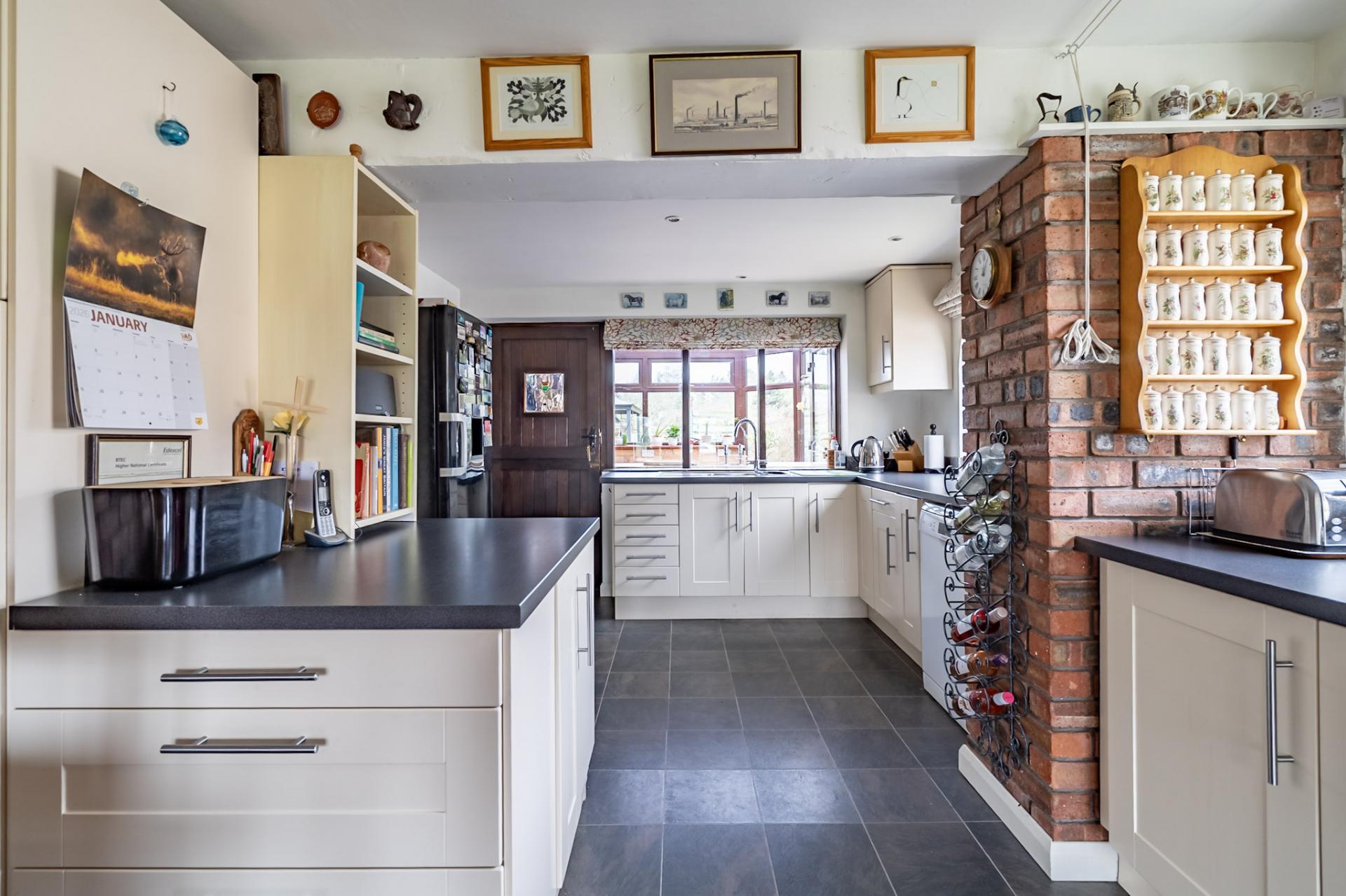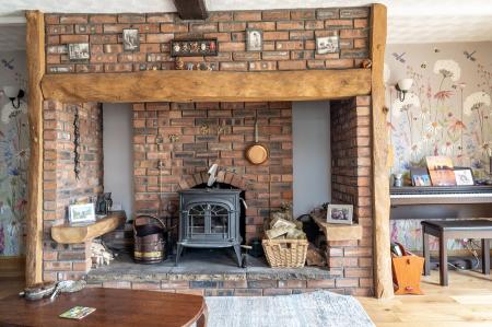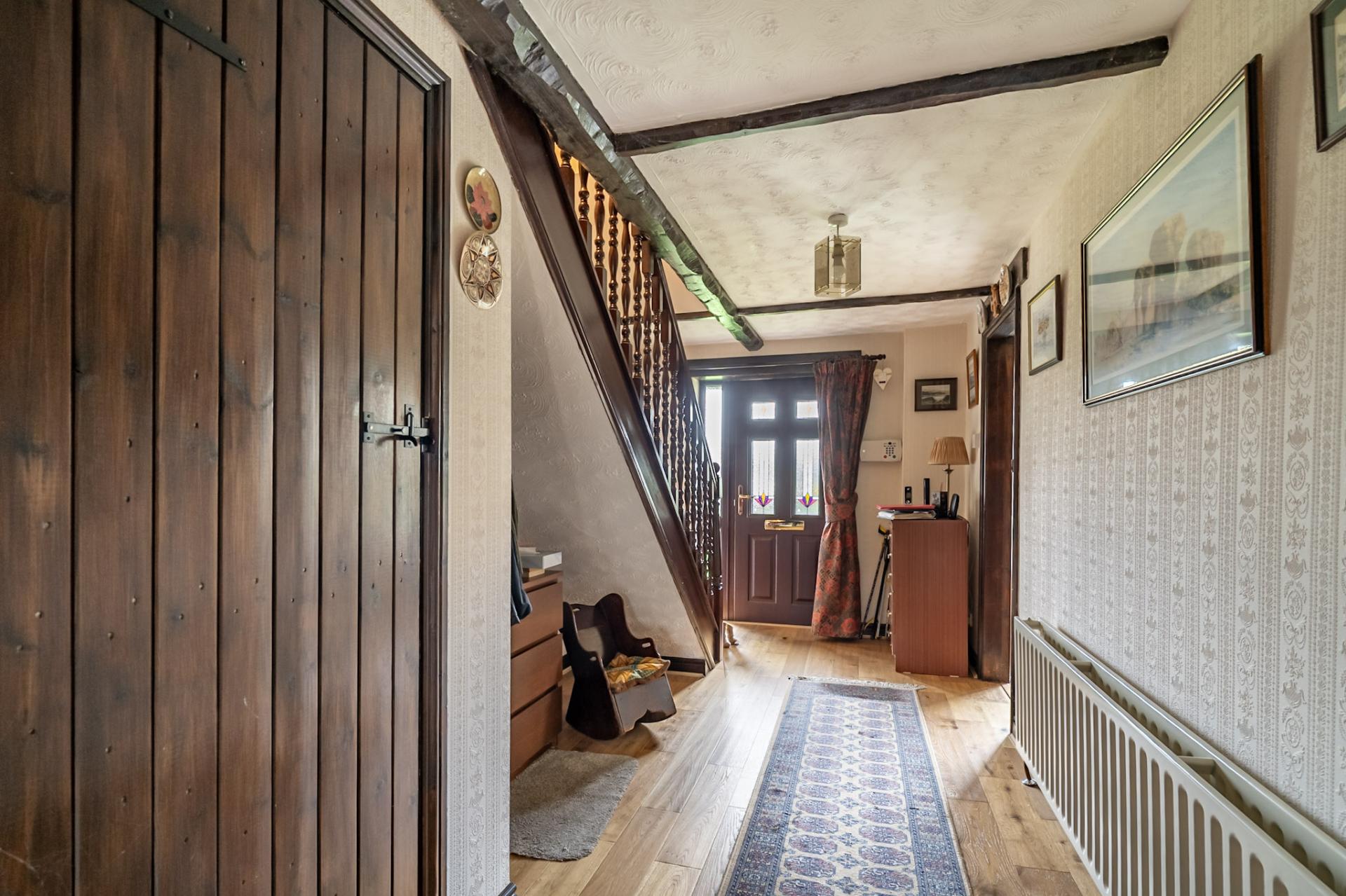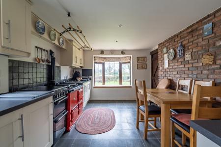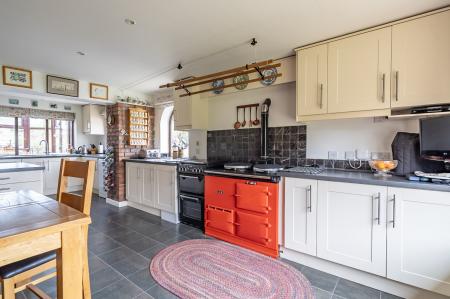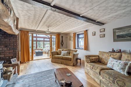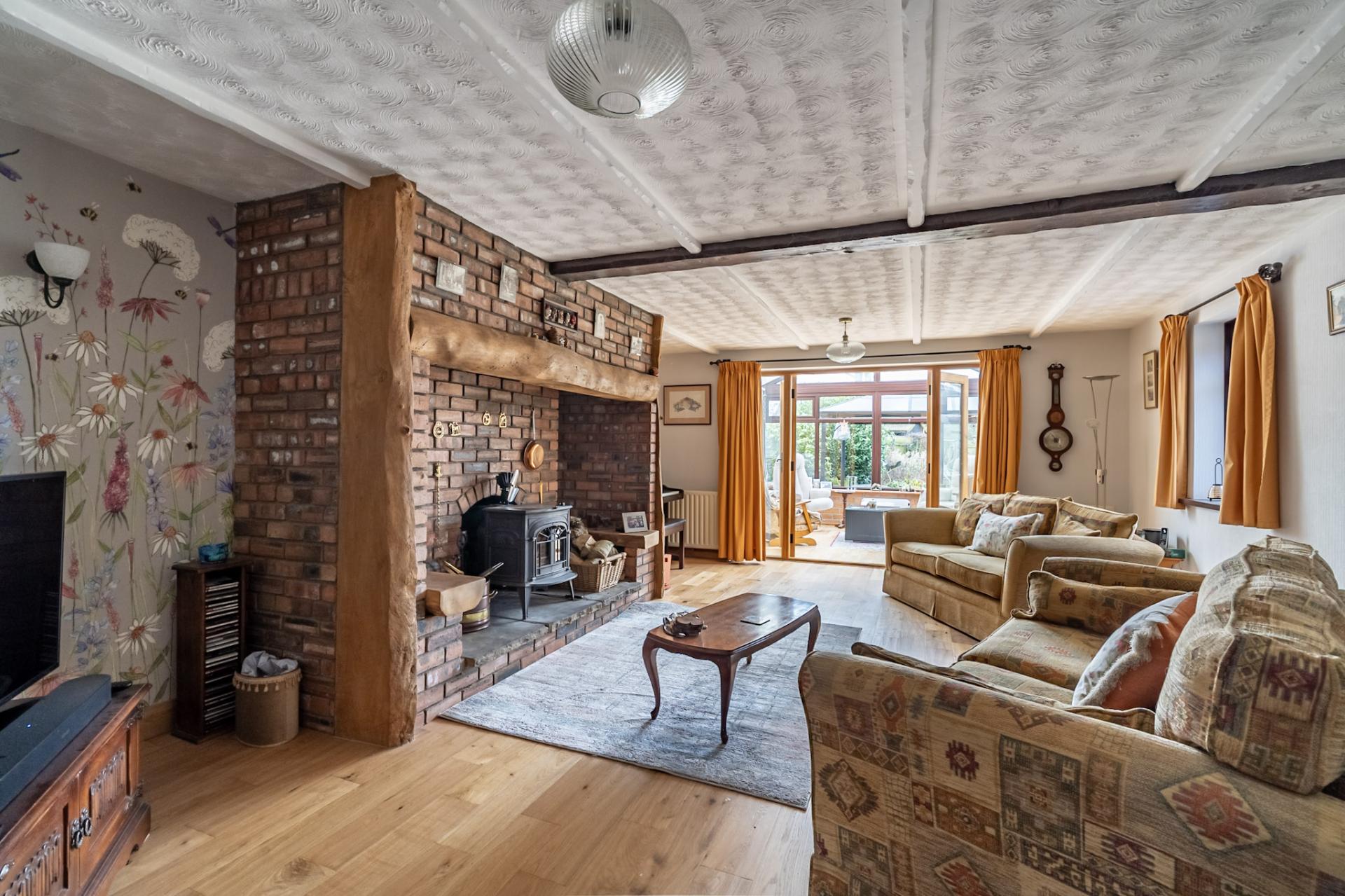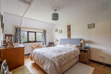 The accommodation is cosy and perfectly suited to countryside living. The living room features a brick-built fireplace with oak beams housing a multi-fuel burner, creating a warm and inviting heart to the home. Oak doors open into the conservatory, which enjoys views over the rear garden, while the cosy dining room sits at the front of the property and boasts characterful beamed ceilings. The breakfast kitchen spans the depth of the house and is centred around a stunning AGA, ideal for both everyday living and entertaining. Completing the ground floor is a practical porch-cum-utility with quarry-style flooring, providing an excellent rear entrance - particularly welcome after winter walks.