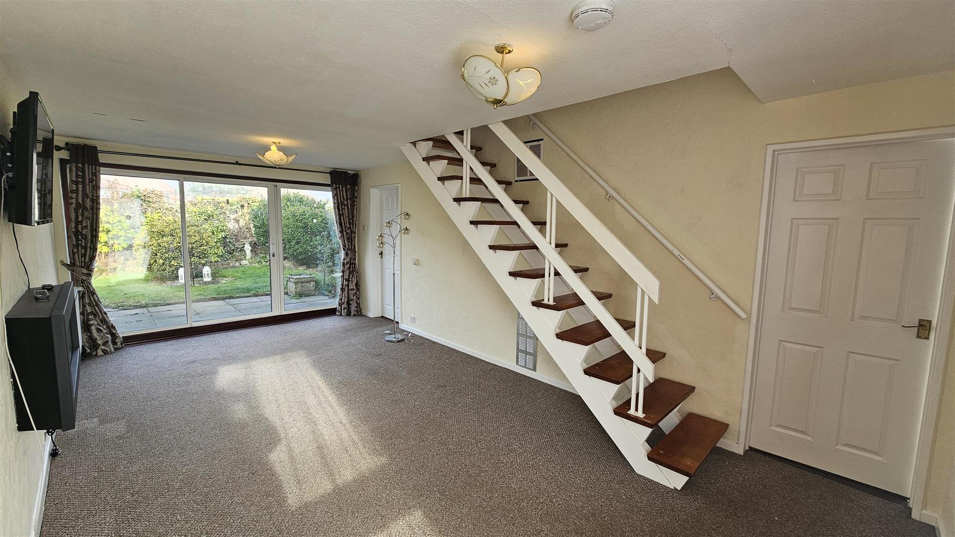 Living Room - 6.27m x 3.30m (20'7 x 10'10) - UPVC Double glazed window to front, Power points, Double Glazed patio doors to garden, Radiator, Carpeted floors, Skirting board and Wooden stairs to First floor landing.