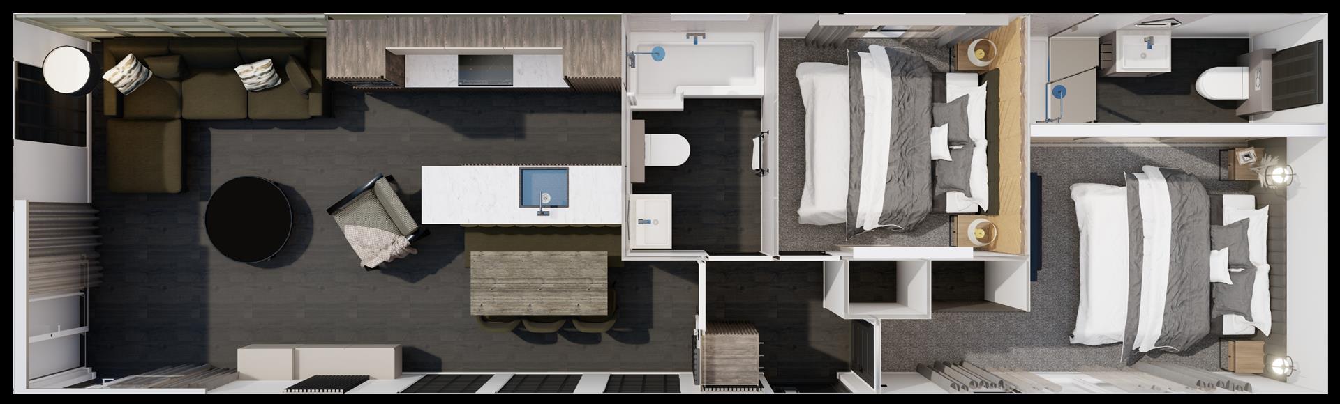 The Khalo lodge offers a truly unforgettable holiday experience for you, our family and your friends. As soon as you step into the lounge you will be blown away with the amount of space you have to unwind and relax. From the huge L-Shaped Sofa to the feature wall panelling, the large windows all highlighting impeccable, stylish, elegant, tasteful design. Make the most of your staycation in the Kahlo Kitchen which has full integrated appliances including a dishwasher and washing machine as standard and a branded induction hob. You can cook your favourite signature dishes in style or a quick lit bite in no time. Bath time has never felt so luxurious in the Kahlo's L-shaped bath with a light interior to sooth you after a long day exploring your surroundings. There is also a large shower in the en-suite of the master bedroom. Choose an office or bedroom as you can quite easily work with a fabulous view as the second bedroom can be easily transformed. You can choose the option of a single chair bed and shelving. The master bedroom is bathed in a natural light from the large window. Enjoy a luxurious king size ottoman lift up bed with a comfy snoove mattress. Guests can enjoy a soothing slumber also in the guest room with a double bed and a feature Herringbone 3D feature wall. Both bedrooms offer all the storage you require.