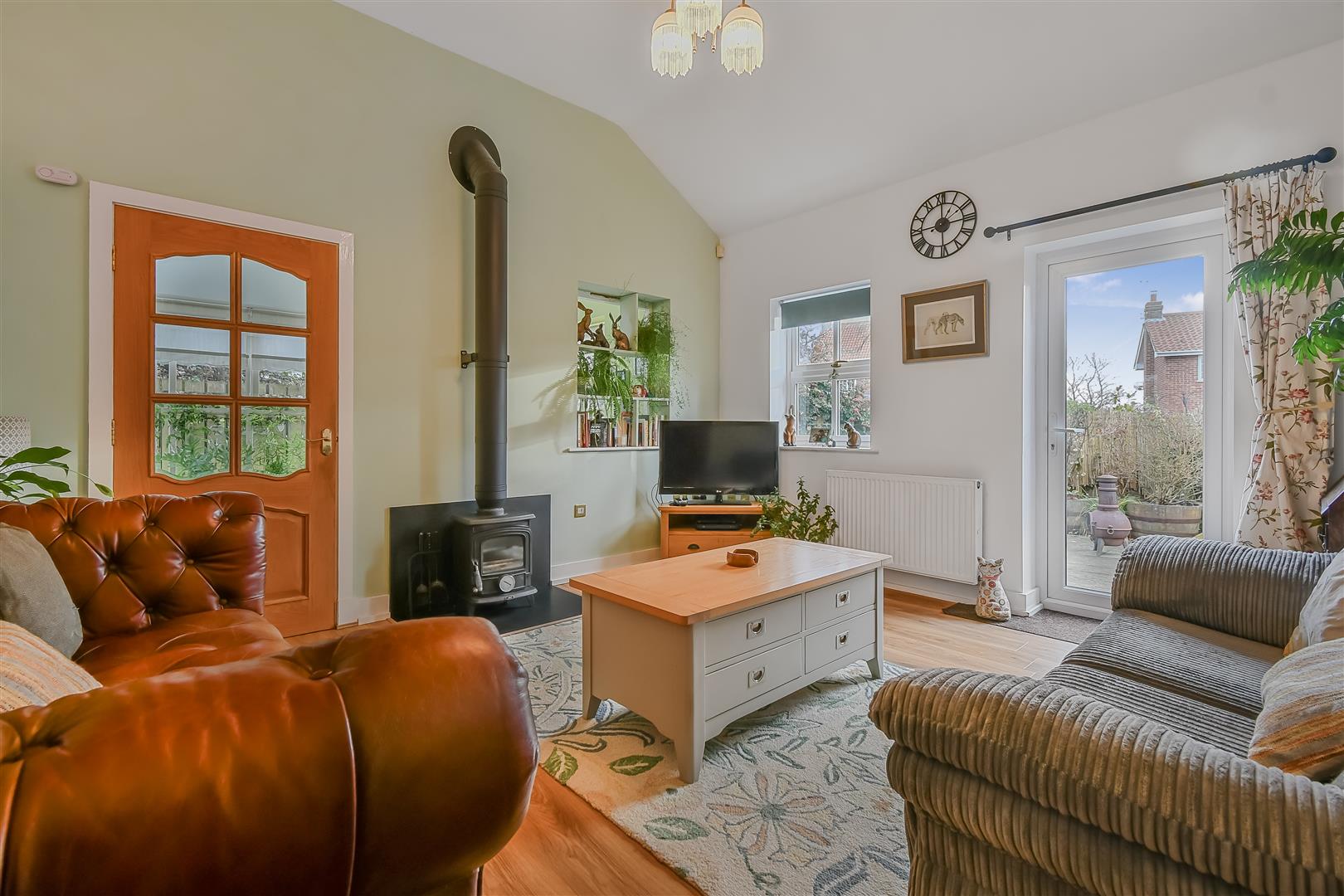 Further timber door leads through to a comfortable SITTING ROOM with eye catching woodburning stove. uPVC glazed door leads out to a most pleasant fully enclosed south facing courtyard.