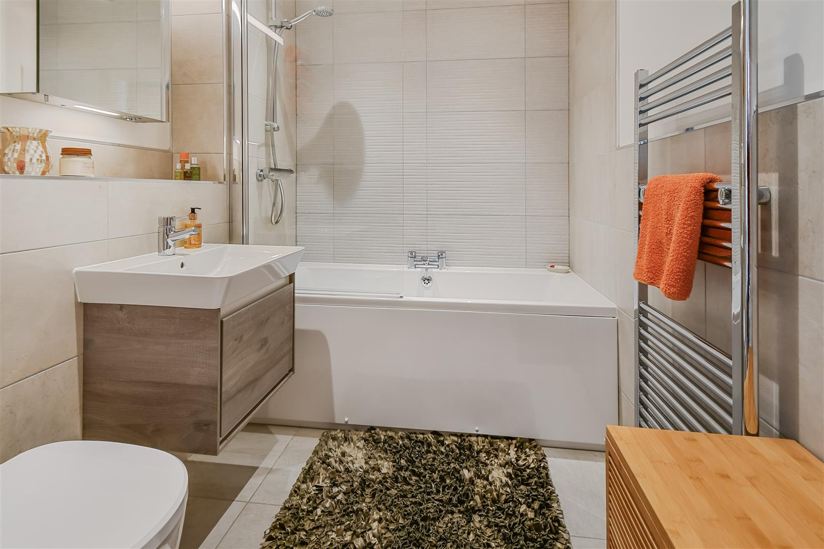 HOUSE BATHROOM white suite comprising panelled bath with shower screen and plumbed shower over, vanity basin with cupboard under, low suite WC, tiled floor, heated chrome towel radiator.