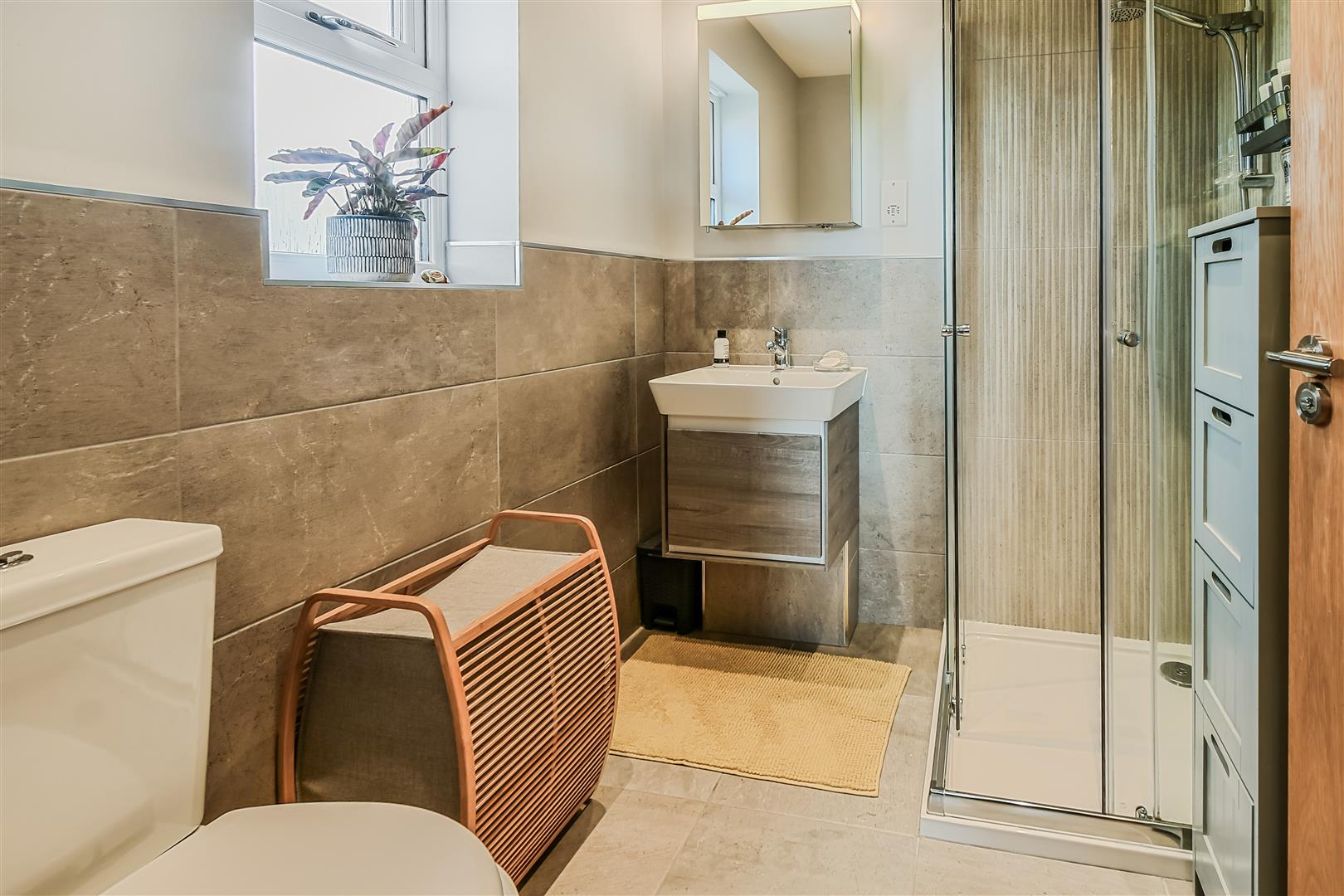 EN SUITE SHOWER ROOM fully tiled mains plumbed shower cubicle, vanity basin with cupboard under, low suite WC, vertical chrome towel radiator. Frosted uPVC double glazed window to the side.
