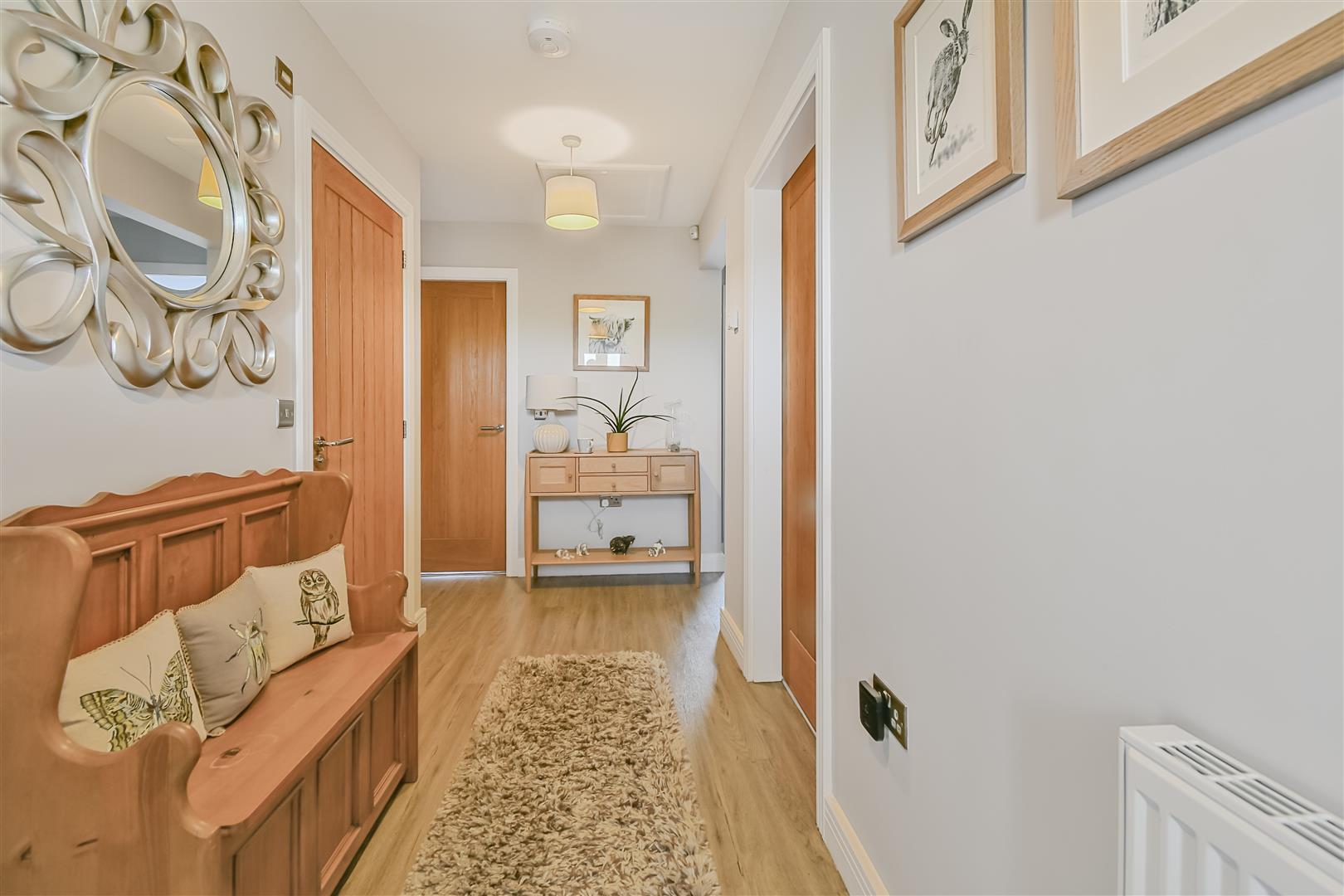 A delightful and welcoming T-shaped RECEPTION HALL with a useful shelved linen cupboard housing the property pressurised hot water cylinder.