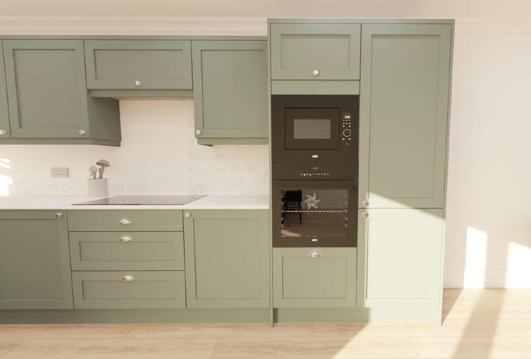 Kitchen Area - High quality shaker style units with quartz work surfaces and AEG integrated appliances including double oven, hob with extractor above, fridge/freezer and dishwasher