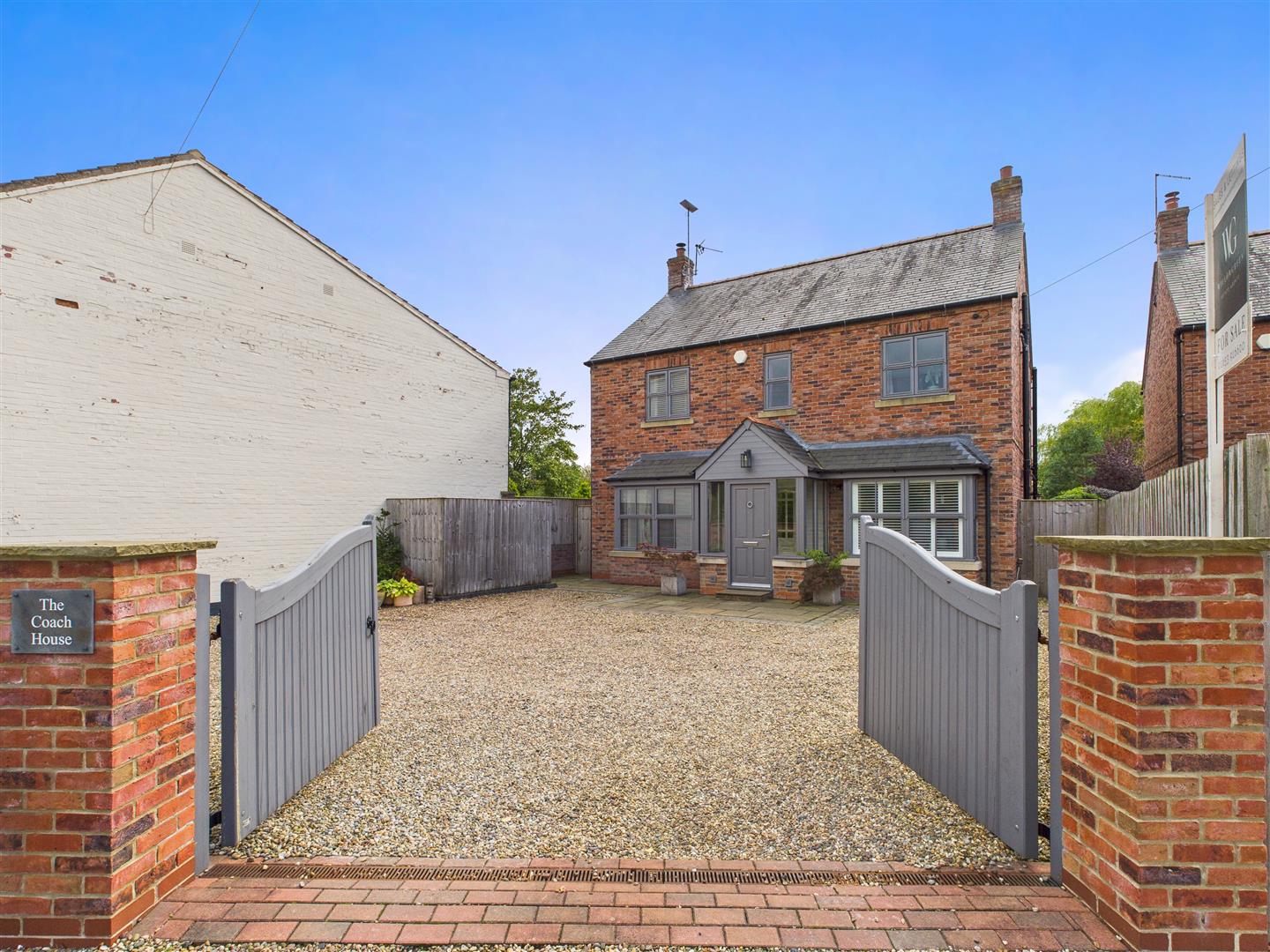 A striking, double bay-fronted five-bedroom home in a peaceful village setting, The Coach House offers generous living space, flexible layouts, and exceptional outdoor areas, including a beautifully landscaped garden with manicured trees and a rare, expansive paddock. The property is approached via double drive gates, adding to its sense of privacy and prestige.
