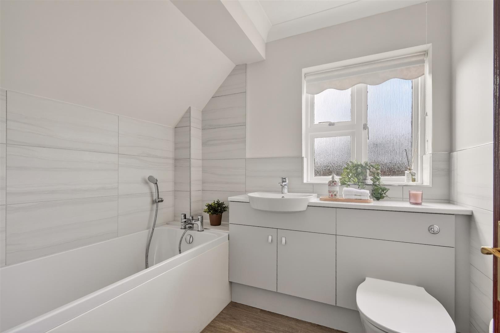 House Bathroom - Modern white suite comprising panelled bath with mixer shower, wash hand basin, w.c., window to side