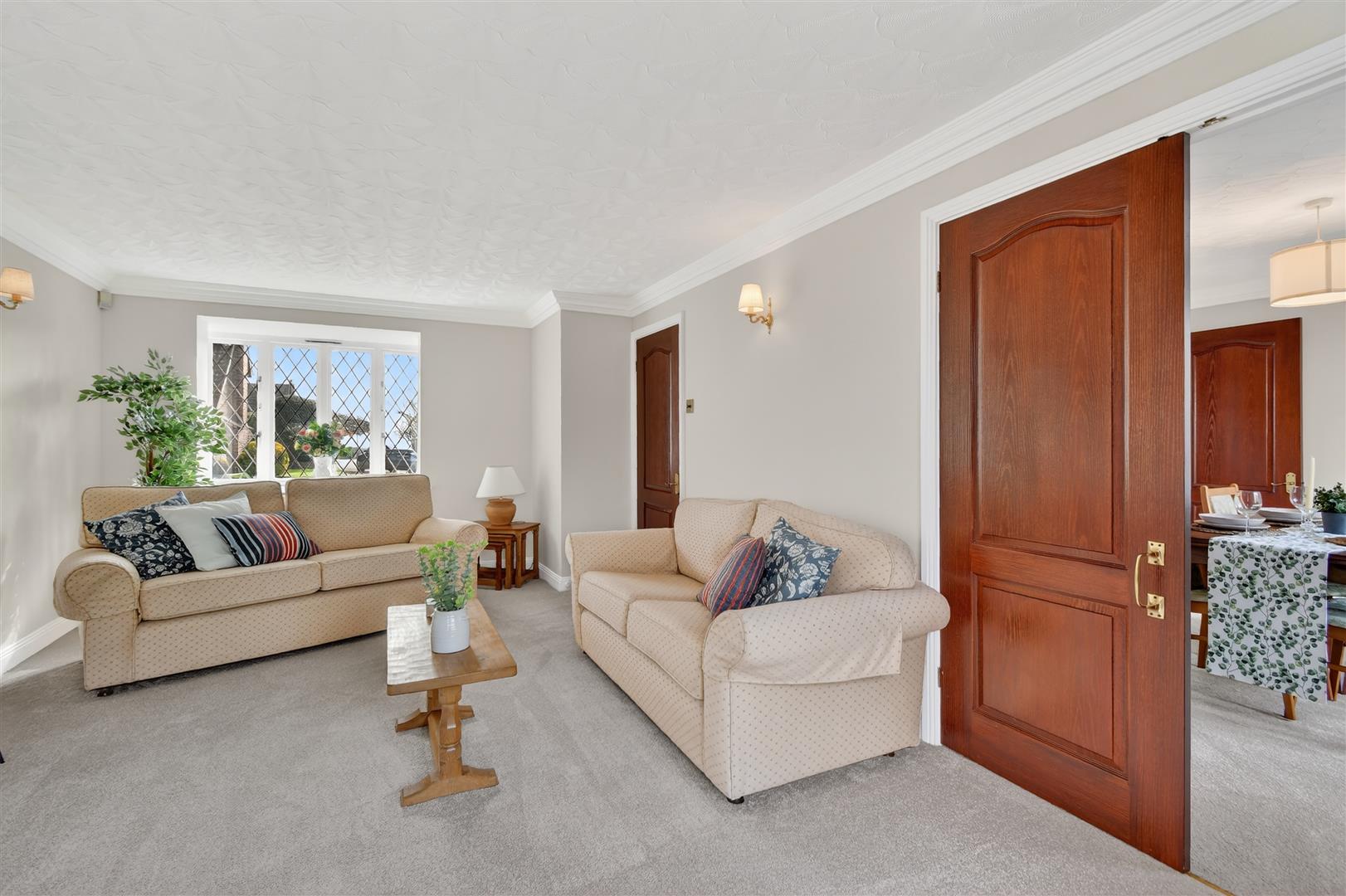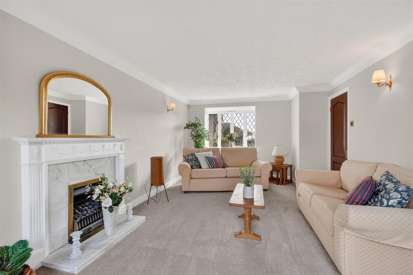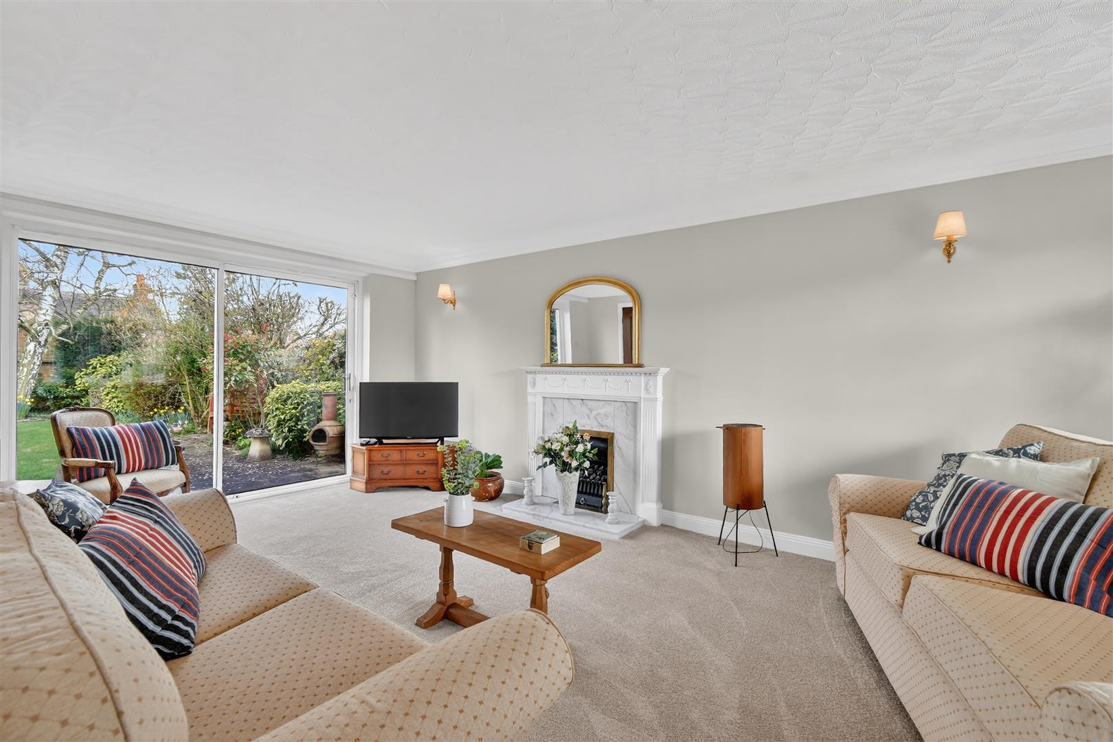 Sitting Room - 6.25m x 3.81m (20'6" x 12'6") - Bright and spacious reception room with window to front and patio doors to rear garden, ceiling cornicing, Adam style fire surround housing living flame fire