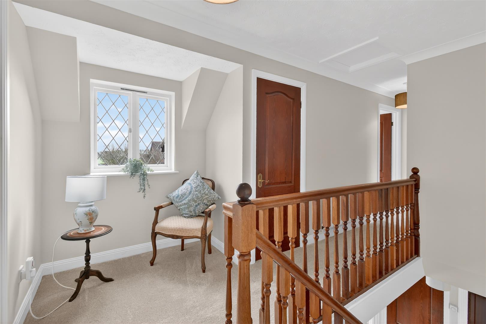 First Floor Landing - Window to front, balustrade, airing cupboard, storage cupboard. Panelled doors to