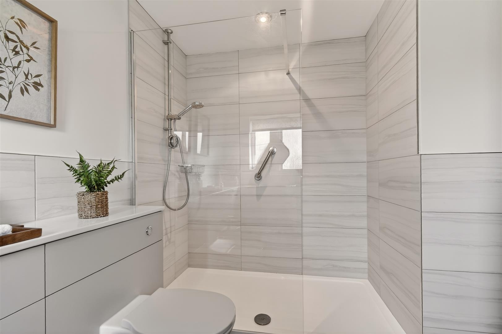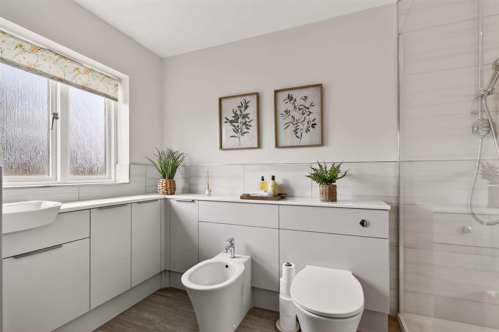 En-Suite - Large walk in shower, vanity unit with wash basin, bidet, w.c., window to rear
