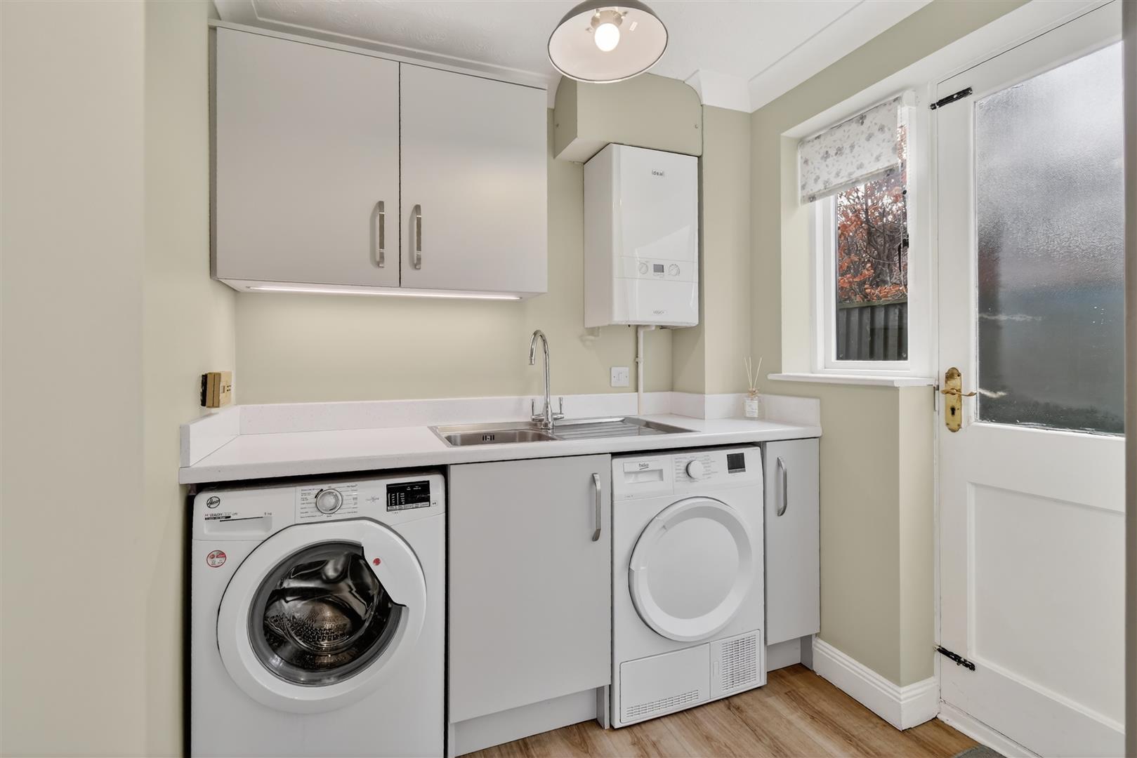 Utility Room - Plumbing for washing machine and space for tumble dryer, work surfaces, wall units. Door to side