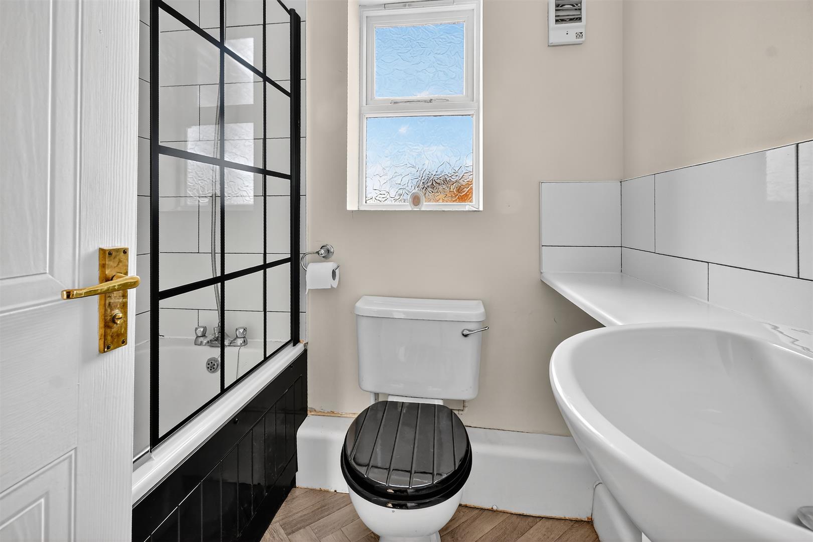 Bathroom - Opaque window to rear, panelled bath with shower over, low level WC, wash hand basin, single panelled radiator, vinyl flooring, shaver point, extractor fan