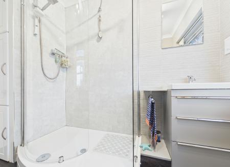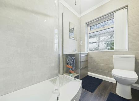 On the opposite side of the property are two generously sized bedrooms and the centrally located bathroom, tastefully renovated in 2024. The bathroom is finished to a modern standard and features a walk-in shower. Bedroom one benefits from integrated wardrobes spanning an entire wall, providing excellent storage, while bedroom two enjoys pleasant views over the rear garden.