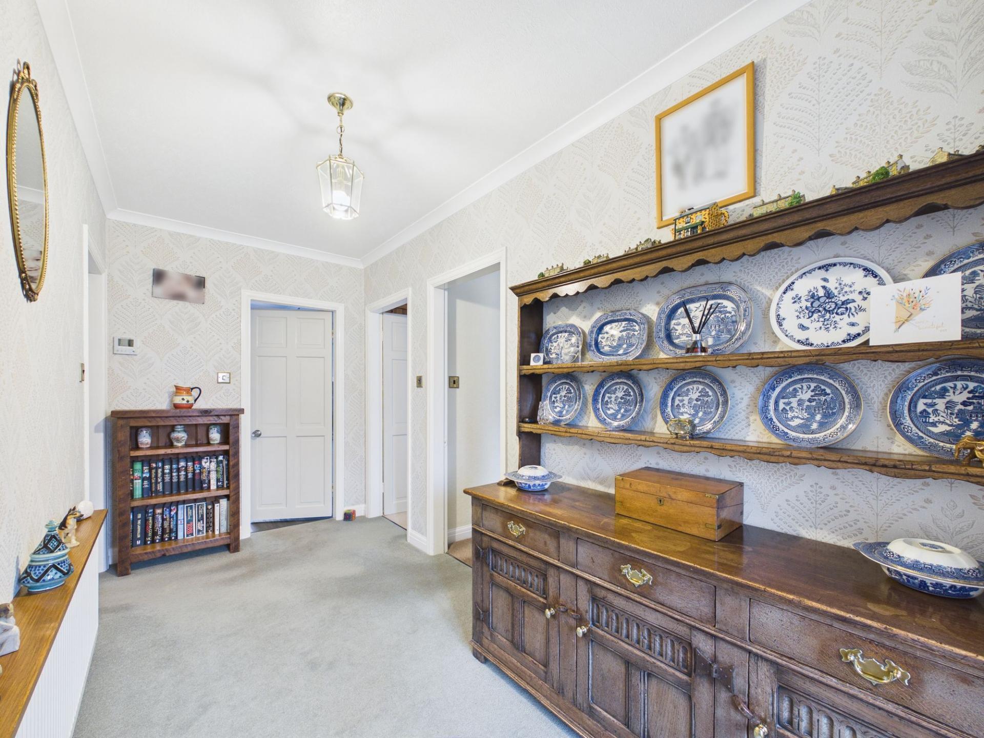 Stepping inside, you are welcomed by a spacious central hallway that sets the tone for the home’s well-planned layout. To the left sits a cosy and inviting lounge with a window to the front, allowing natural light to pour in. A striking mantelpiece forms the focal point of the room, housing a recently installed log burner that creates a warm and welcoming atmosphere, perfect for quieter evenings.