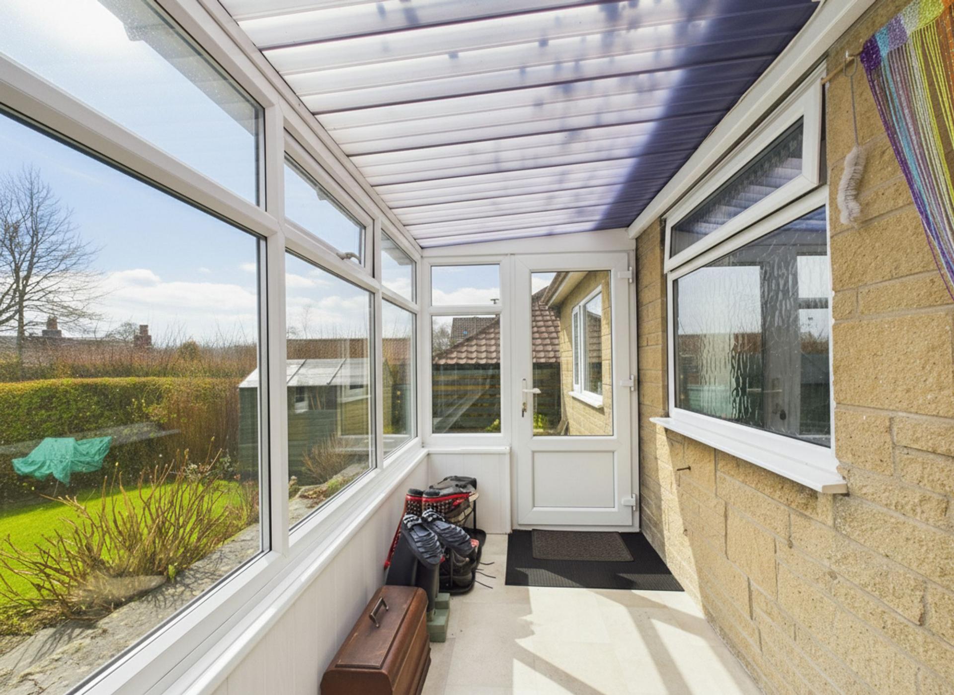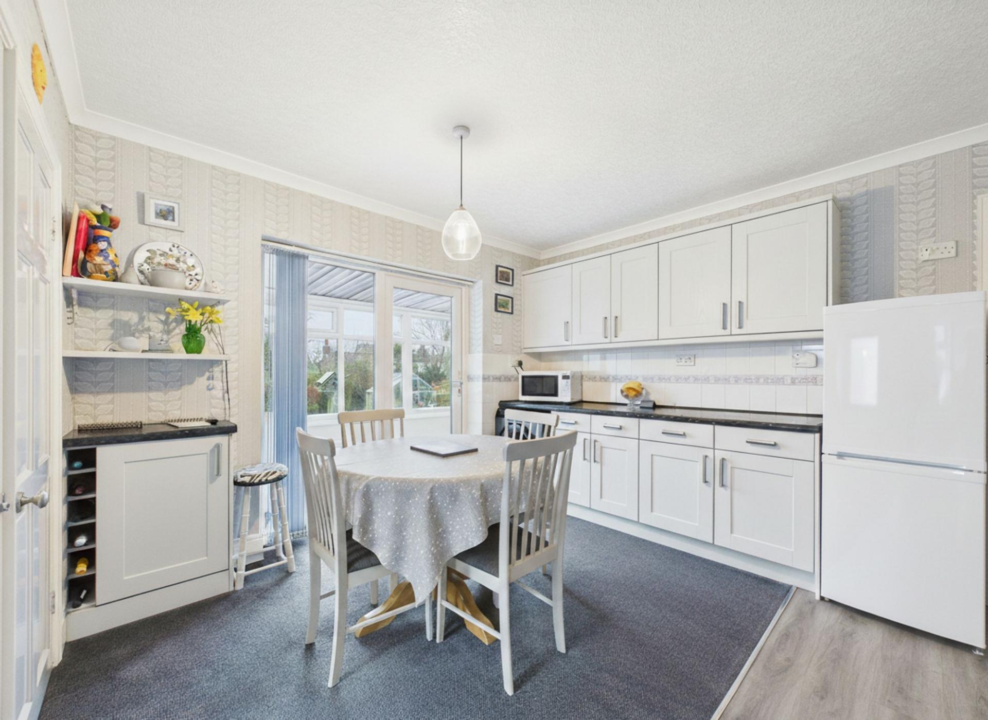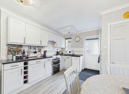 Positioned to the rear, the kitchen is a modern and highly functional space featuring shaker-style cabinetry, generous work surfaces, and ample storage, including a built-in pantry area. A side door provides convenient external access, while a further door leads through to a conservatory-style sunroom/boot room, an excellent transitional space ideal for coats, boots, and everyday practicality, with direct access to the garden and patio.
