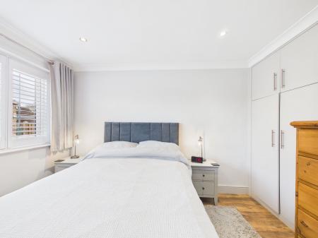 The principal bedroom is positioned to the front and benefits from a full wall of integrated wardrobes and a modern ensuite shower room. The second bedroom, located to the rear, also includes integrated wardrobe space and enjoys views over the garden. The main bathroom is fitted with a bath with overhead shower and heated towel rail.