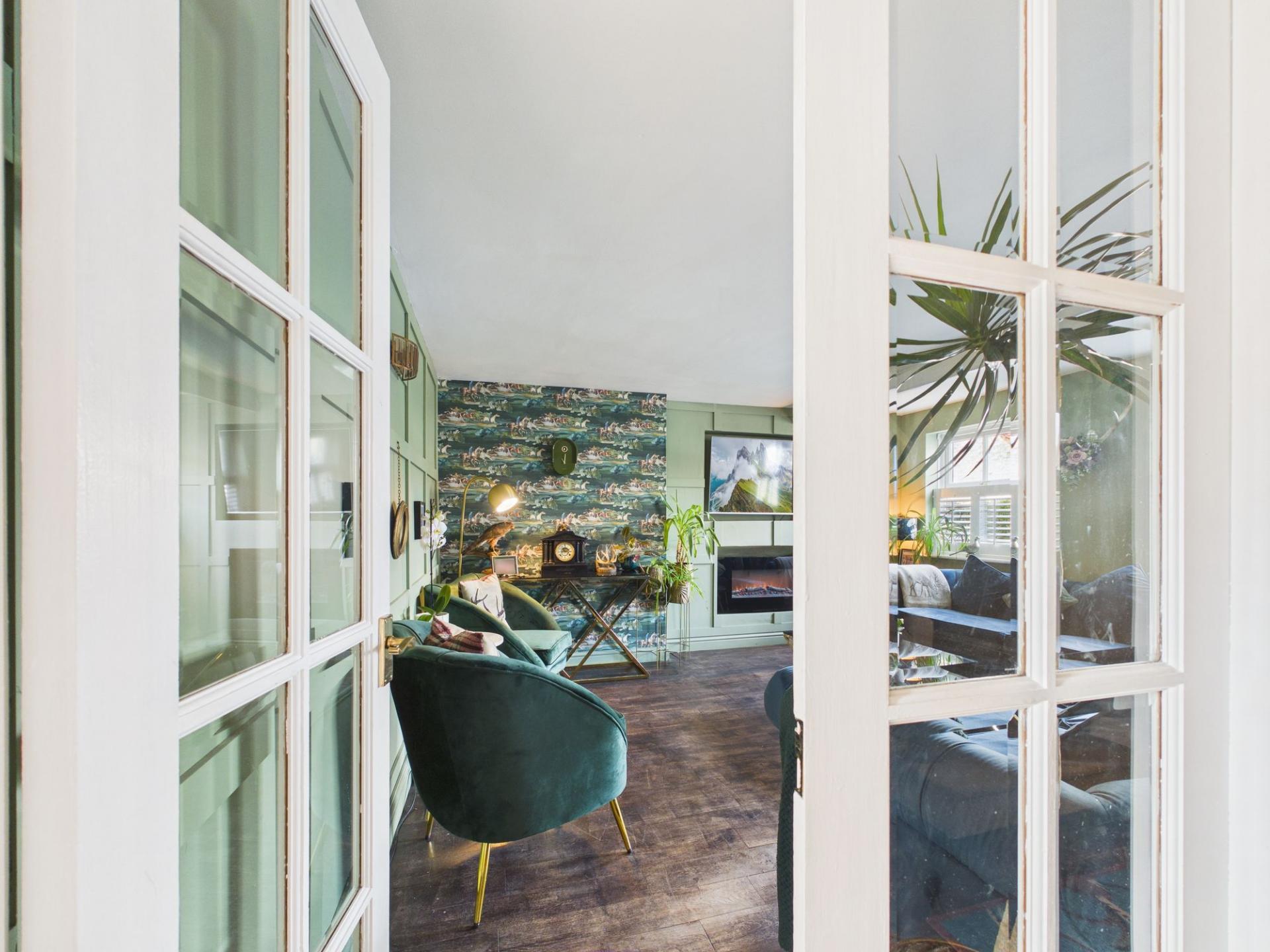 To the front of the property sits the inviting lounge, a calm and relaxing retreat featuring two sage-green panelled walls that create a warm and soothing atmosphere. An electric fire provides both a cosy focal point and excellent heating, while the panelled wall surrounding it has been cleverly designed with a recessed space for a television, forming a sleek, seamless media wall. Two front-facing windows with wooden shutter blinds allow plenty of natural light, and double doors connect the lounge to the hallway. These doors offer flexibility, open them to create an easy flow through to the kitchen when entertaining, or close them to enjoy a quieter, more intimate living space.