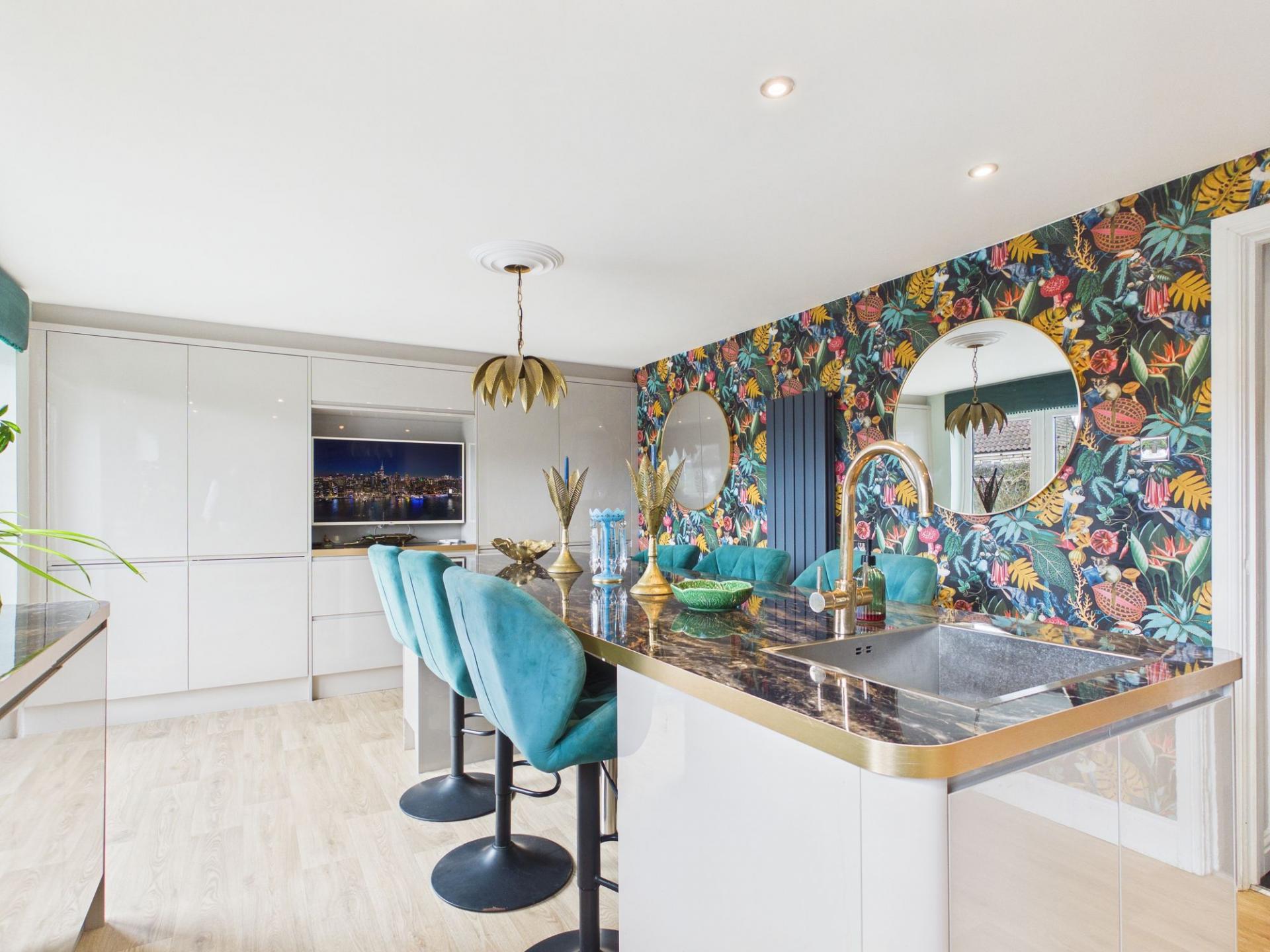 At the heart of the home lies the impressive kitchen, a truly social space designed for both everyday living and entertaining. A striking central island forms the focal point of the room, featuring a marble-effect worktop with inset sink and tap. Its generous proportions and clever layout allow it to double as a kitchen table, with ample room for stools on either side, creating the perfect spot for casual dining or gathering with family and friends. A full wall of integrated cabinetry provides extensive storage, with an integrated fridge/freezer neatly positioned at the end of the kitchen. Light neutral cabinetry pairs beautifully with elegant gold accents from the worktops and tap, while the induction hob, electric oven and integrated dishwasher ensure the space is as practical as it is stylish. A vibrant floral statement wallpaper adds a wonderful pop of personality, and French doors open directly onto the garden, allowing natural light to flood the room and creating an effortless connection to the outdoors.