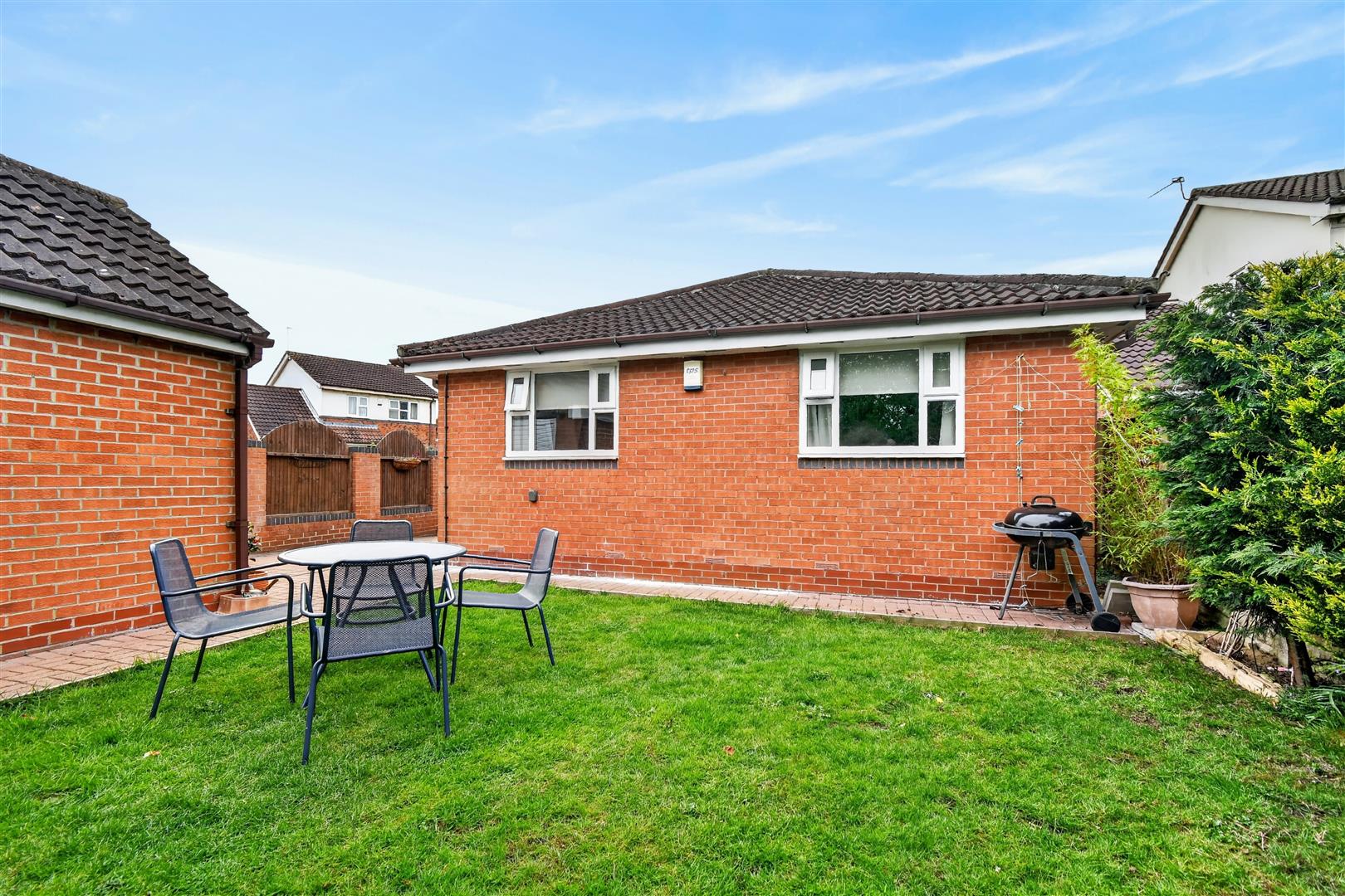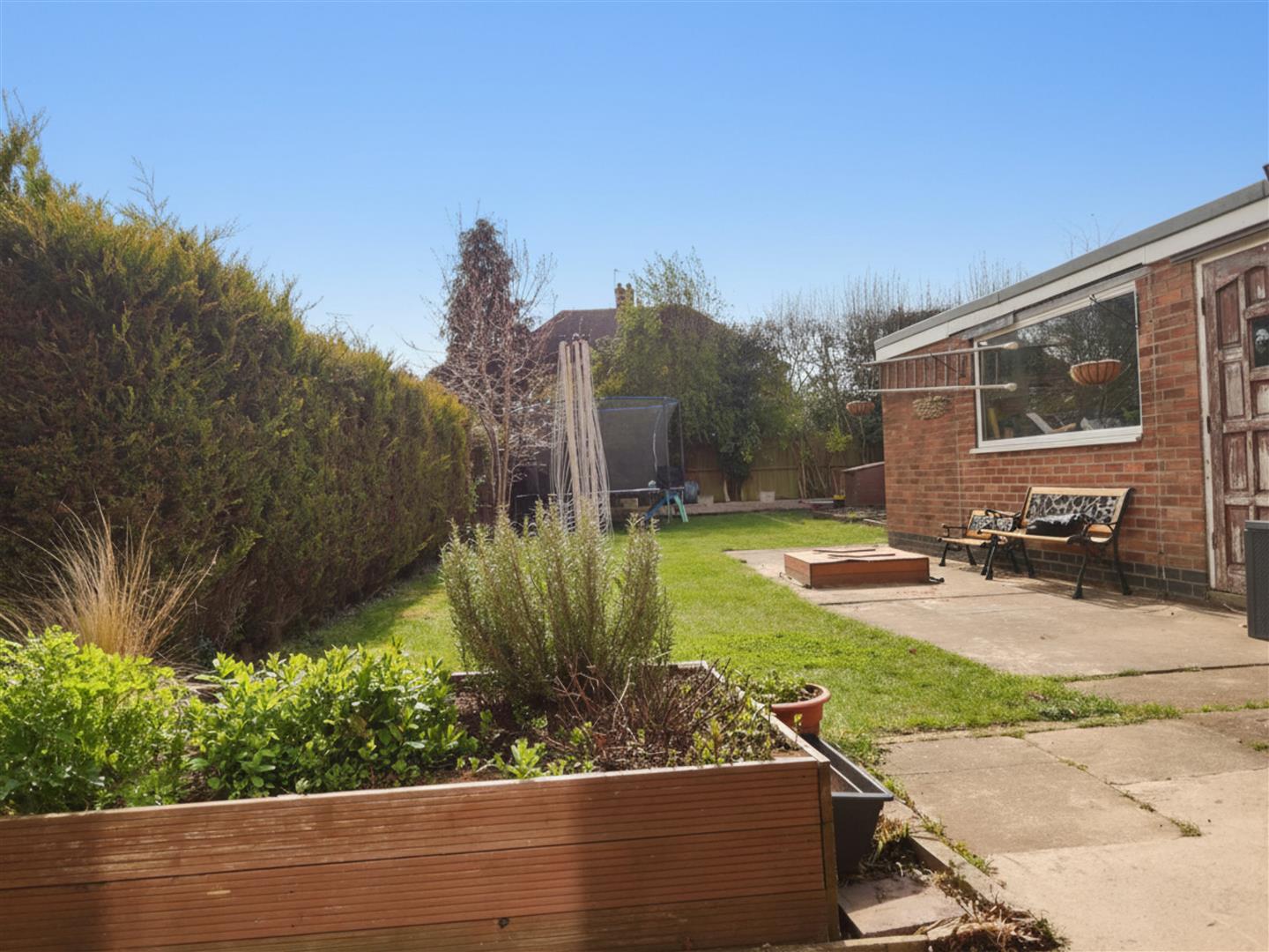 - Rear garden with lawn, patio, flower borders, and timber fencing