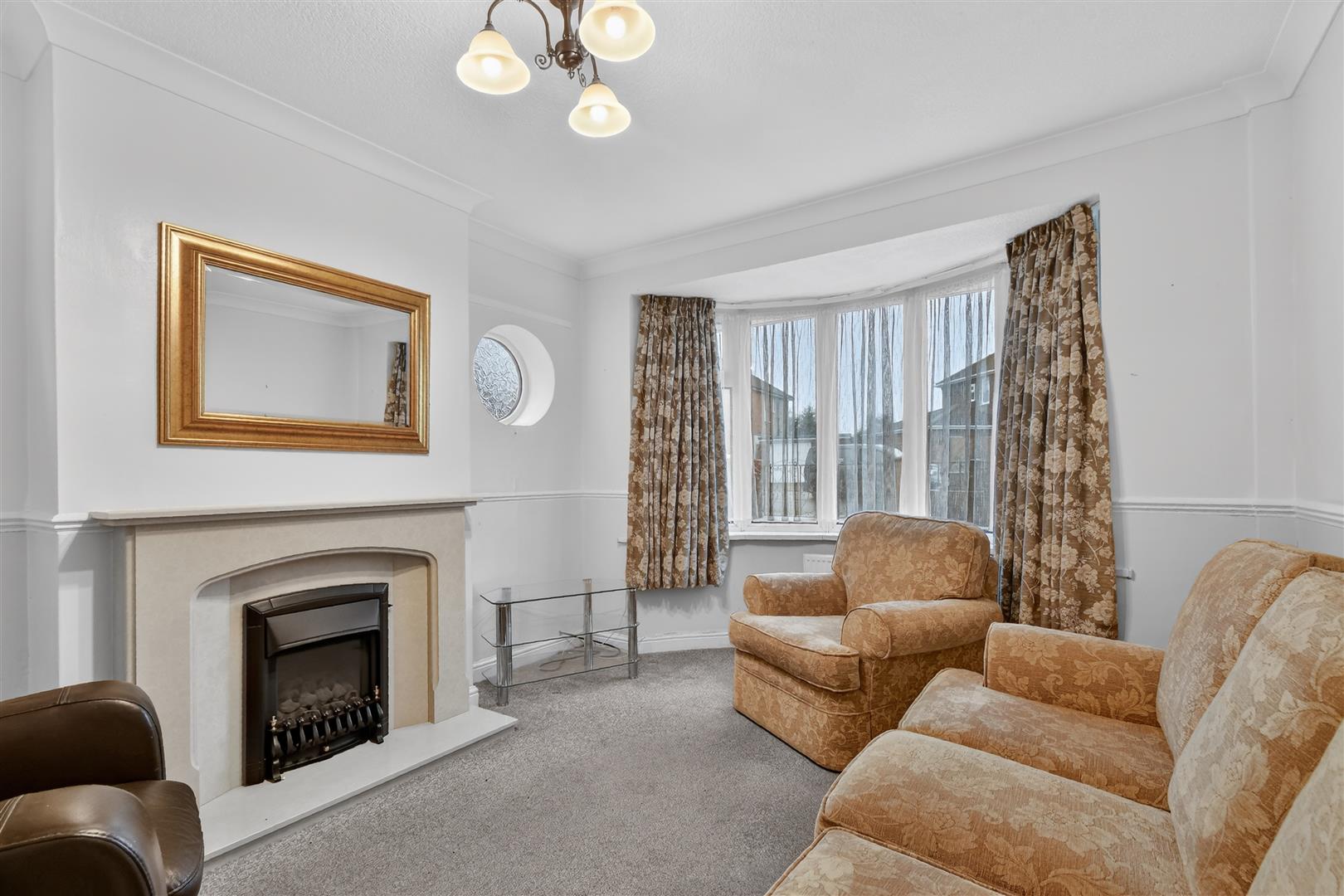 Lounge - uPVC bay window to front, two windows to side, gas fire with surround, two double panelled radiators, carpeted flooring, power points