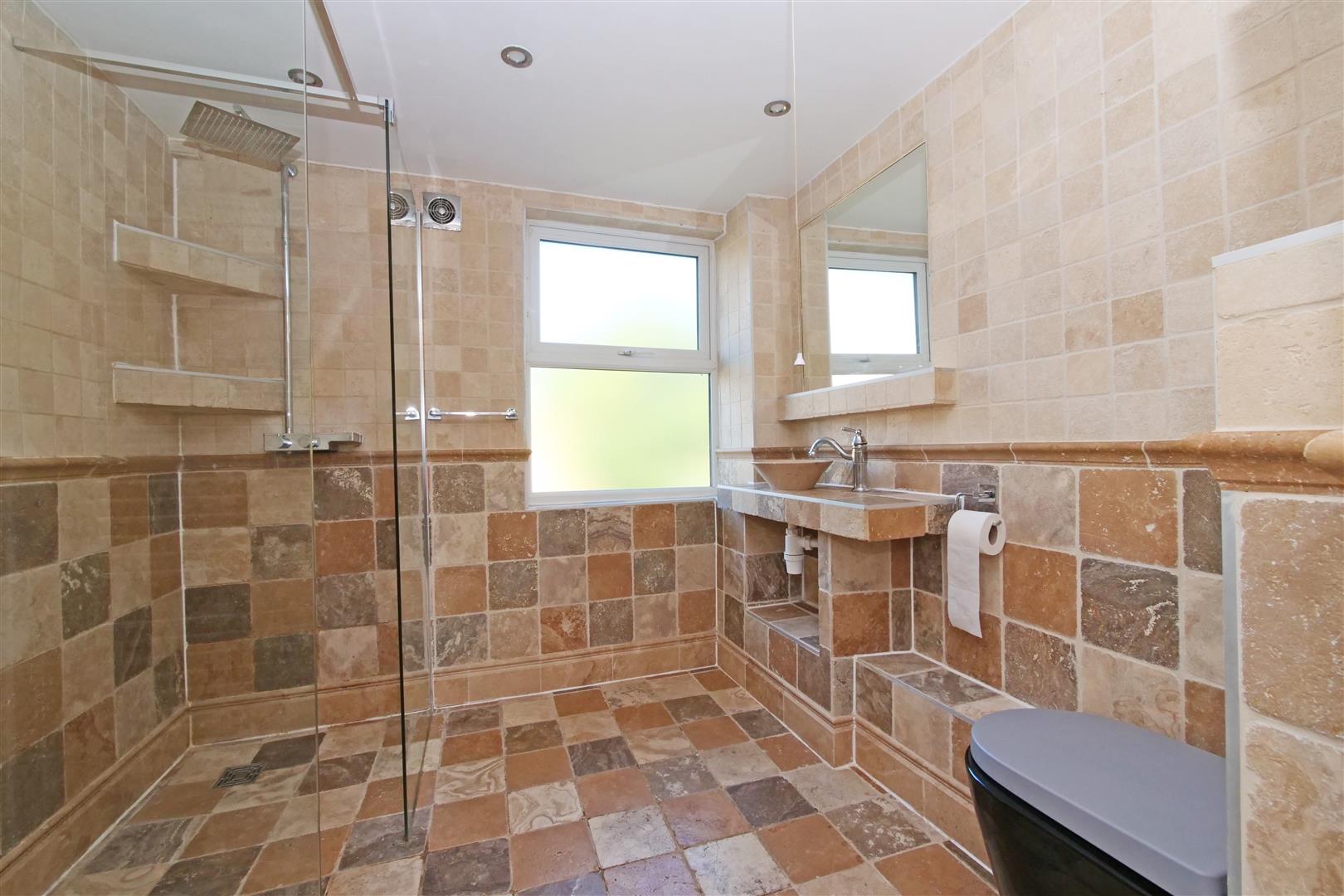 Bathroom - Opaque uPVC window to rear, large walk-in tiled shower enclosure, low level wc, wash hand basin, tiled walls and flooring, towel radiator, extractor fan