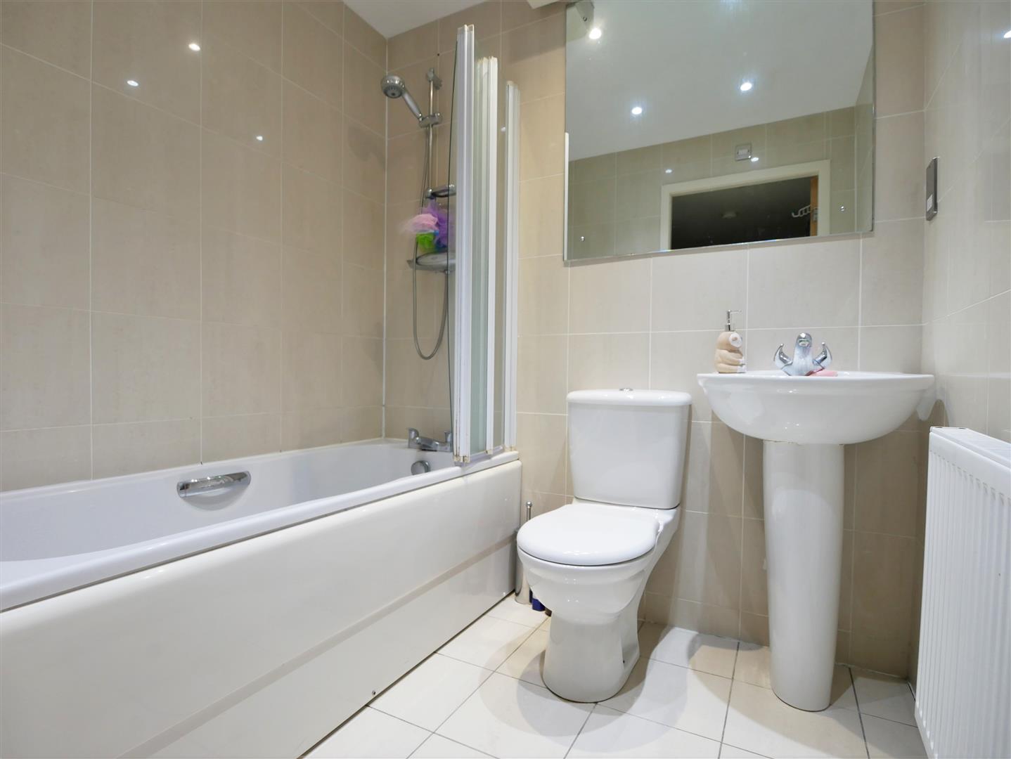 Bathroom - Panelled bath with mins shower over, pedestal wash hand basin, low level WC, double panelled radiator, recessed spotlights, extractor fan, tiled walls. Tiled flooring.