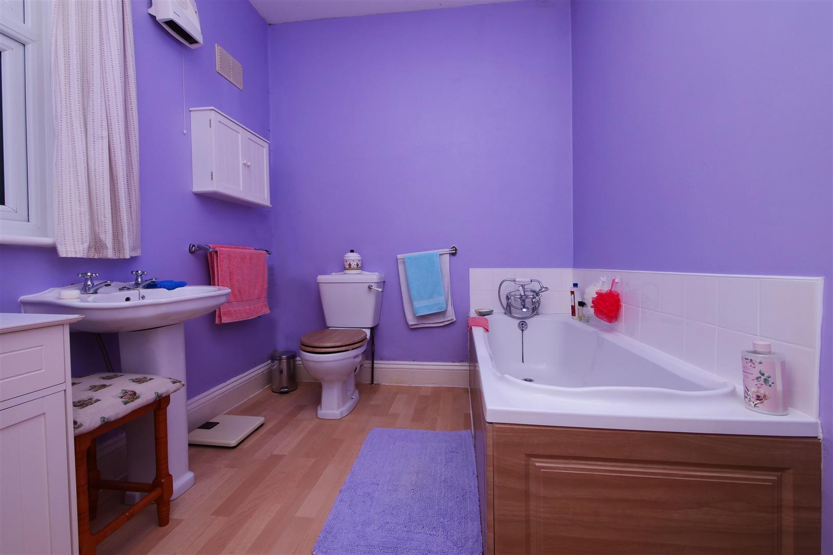 Bathroom - Opaque uPVC window to side, pedestal wash hand basin, low level WC, panelled bath with mixer tap, single panelled radiator, vinyl flooring, wall mounted heater