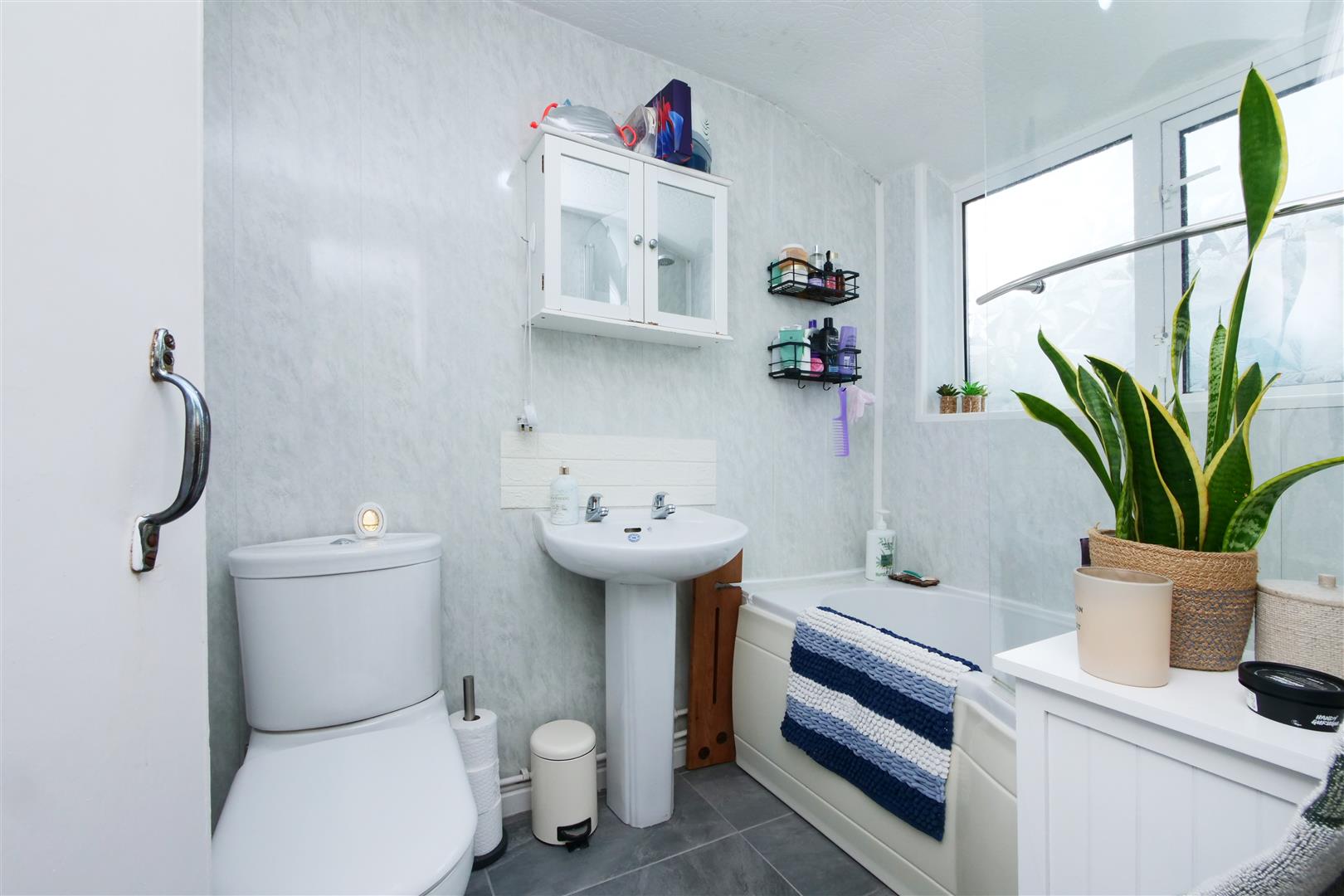 Bathroom - Opaque uPVC window to side, 'P' shaped panelled bath with mixer head over, wash hand basin, low level wc, double panelled radiator, 'Aquaboarding', tiled flooring