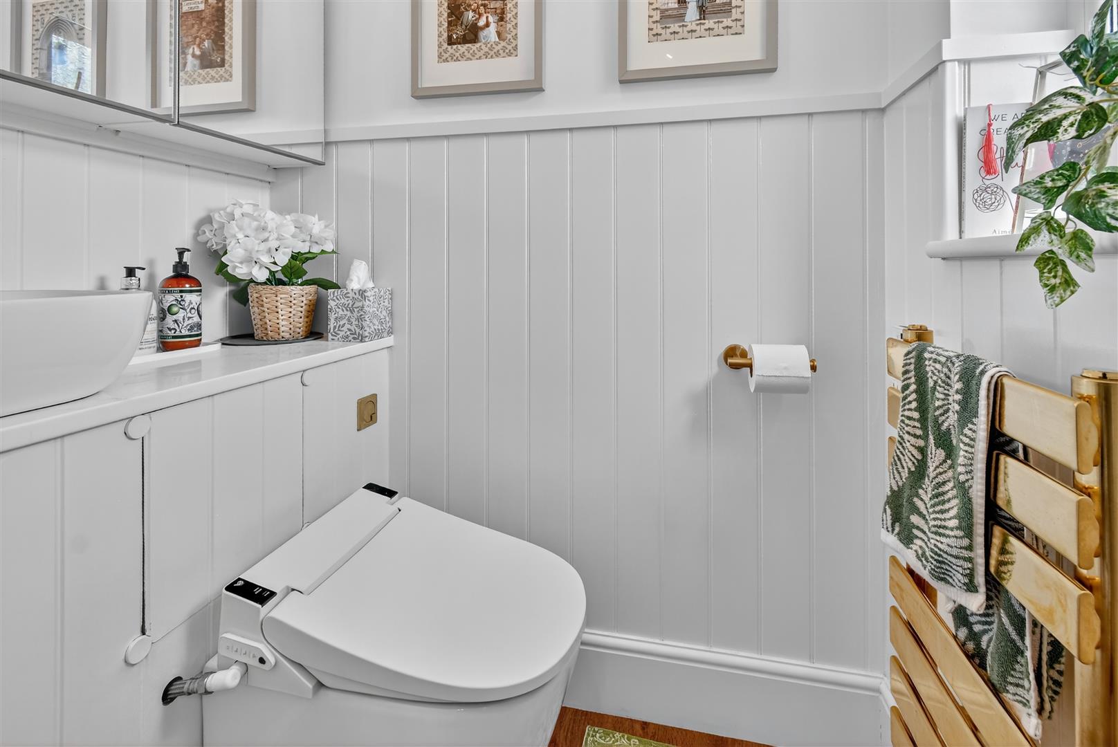 Wc/Cloaks - Low level WC, wash hand basin, opaque window to side, laminate flooring, extractor fan, towel radiator