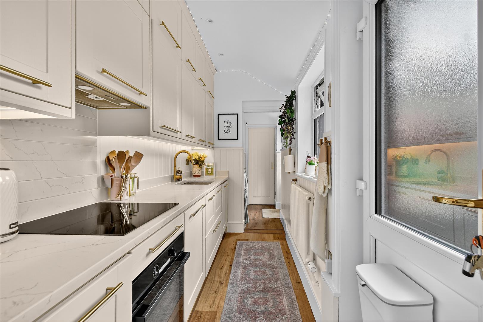 Kitchen - Built-in wood effect cream Shaker style wall and base units with quartz countertop, sink with mixer tap, column radiator, built-in fridge and freezer, oven and hob, integrated dishwasher, recessed spotlights, window to side, door to courtyard, laminate flooring, power points