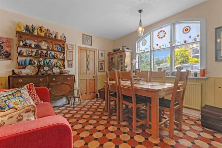 Dining Room - Large slide sash window to side, feature log burner with surround, walk-in pantry cupboard, further cupboard, single panelled radiator, power points. Tiled flooring.
