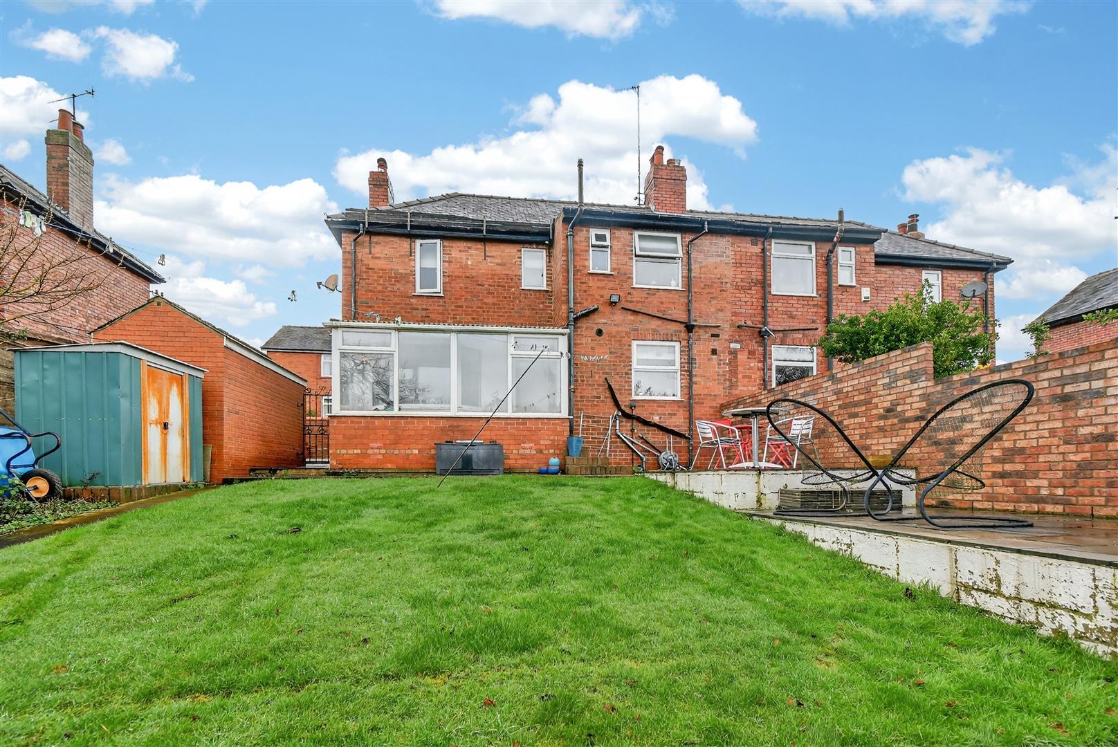 - Rear lawned garden with raised paved patio