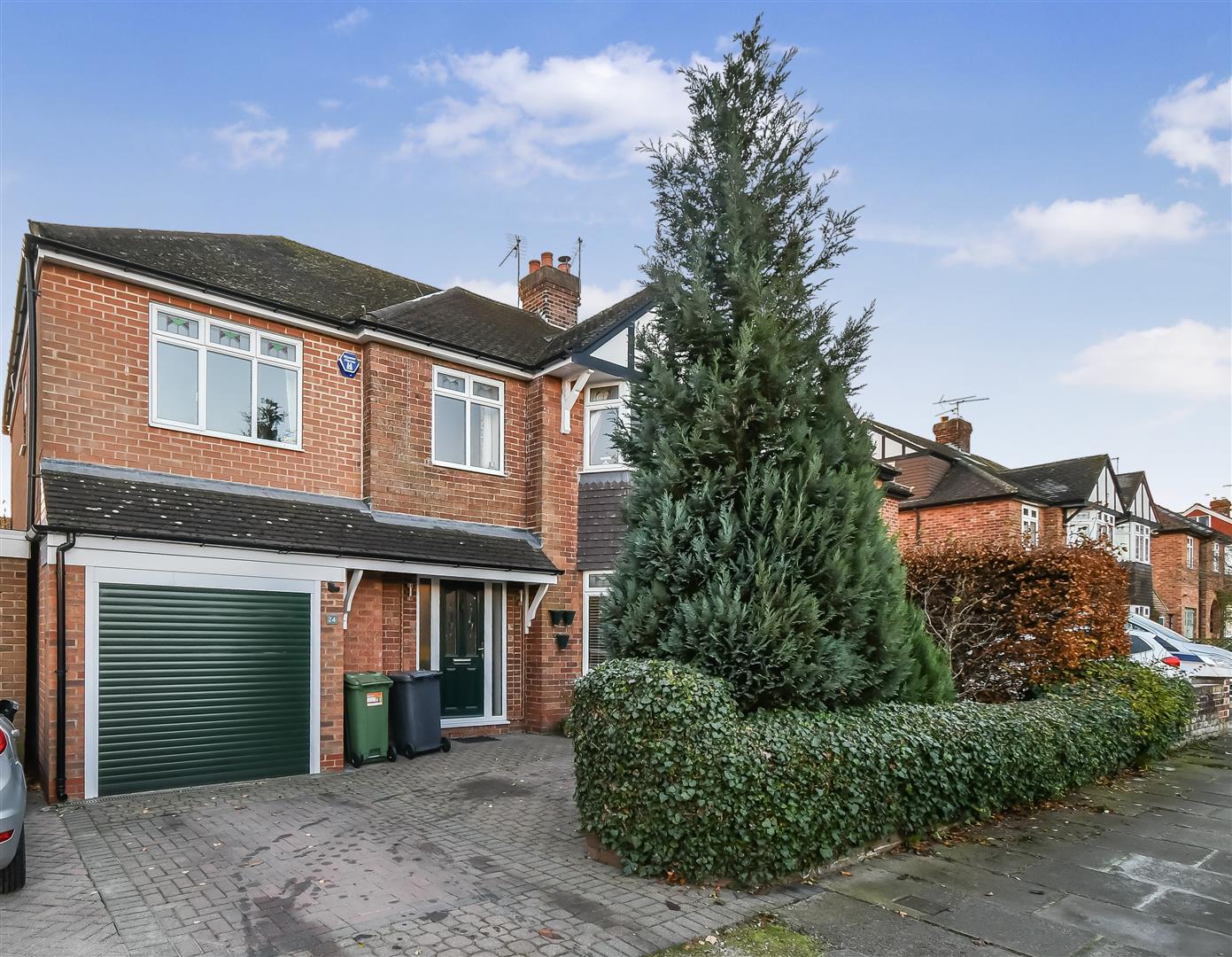 The bright and spacious living accommodation briefly comprises entrance hallway, dining room with bay window to front, 19' lounge, kitchen, garden room with French doors, ground floor shower room, first floor landing, five bedrooms (four doubles and one generous single/study) and two separate three-piece shower rooms. To the outside is a front garden with brick boundary wall, driveway providing ample off street parking with potential for electric car charging and leading to an attached single garage/store whilst to the rear is a long enclosed garden with mature trees and woodland area, lawn and paved patio. The property also benefits from modern central heating and rear solar panels. An internal viewing is highly recommended.