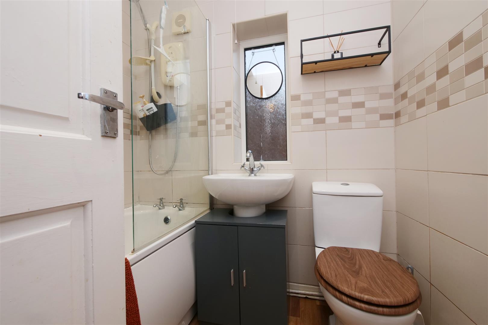 House Bathroom - uPVC window to side and front, WC, wash hand basin, bath with shower over, linoleum flooring, skirting