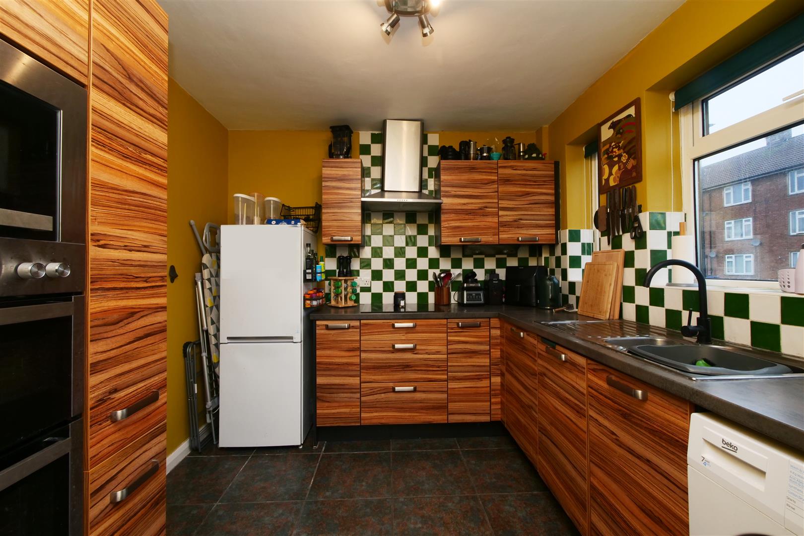 Kitchen - 2.69m x 2.67m (8'10" x 8'9") - uPVC windows to front, tiled flooring, wall and base units with counter top, stainless steel sink and drainer, electric hob, electric oven and grill, integrated microwave, storage cupboard, space and plumbing for appliances, power points, skirting