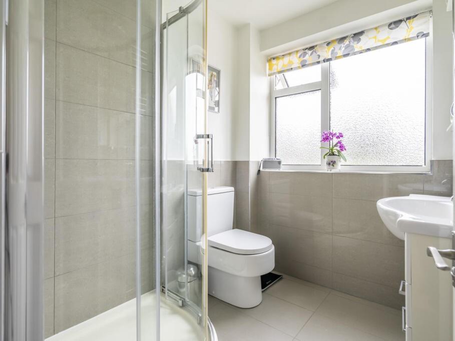 Shower Room - Modern shower room with walk-in shower, low level wc, sink set in attractive vanity unit, part tiled walls, tiled floor, heated towel rail
