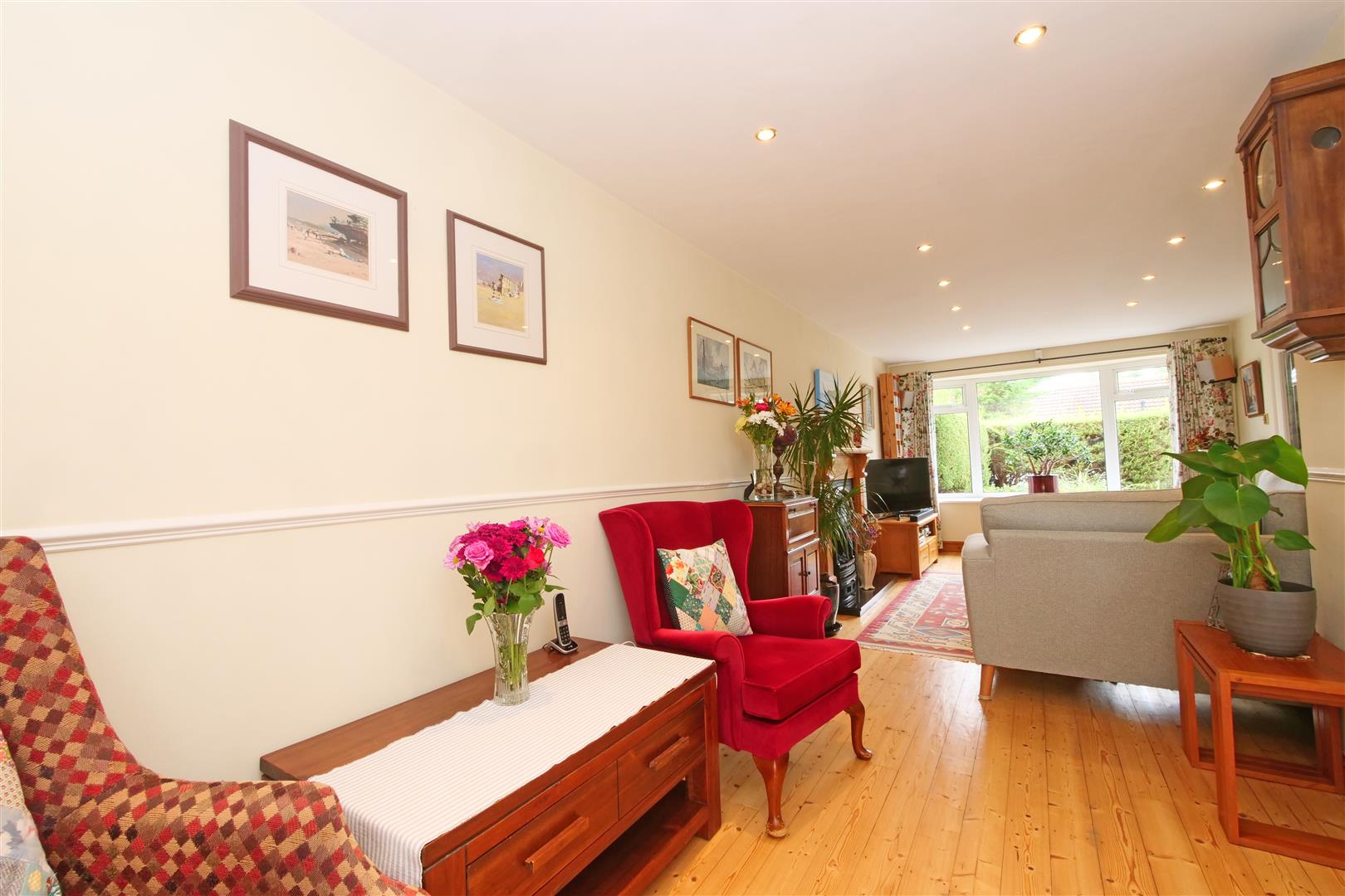 Living/Dining Room - Centering upon a gas fire set in an attractive wood surround and cast inset, bay window to the front providing lots of natural light, wood flooring, spotlights to ceiling, wall lights, dado rail, window to rear, French doors leading to;