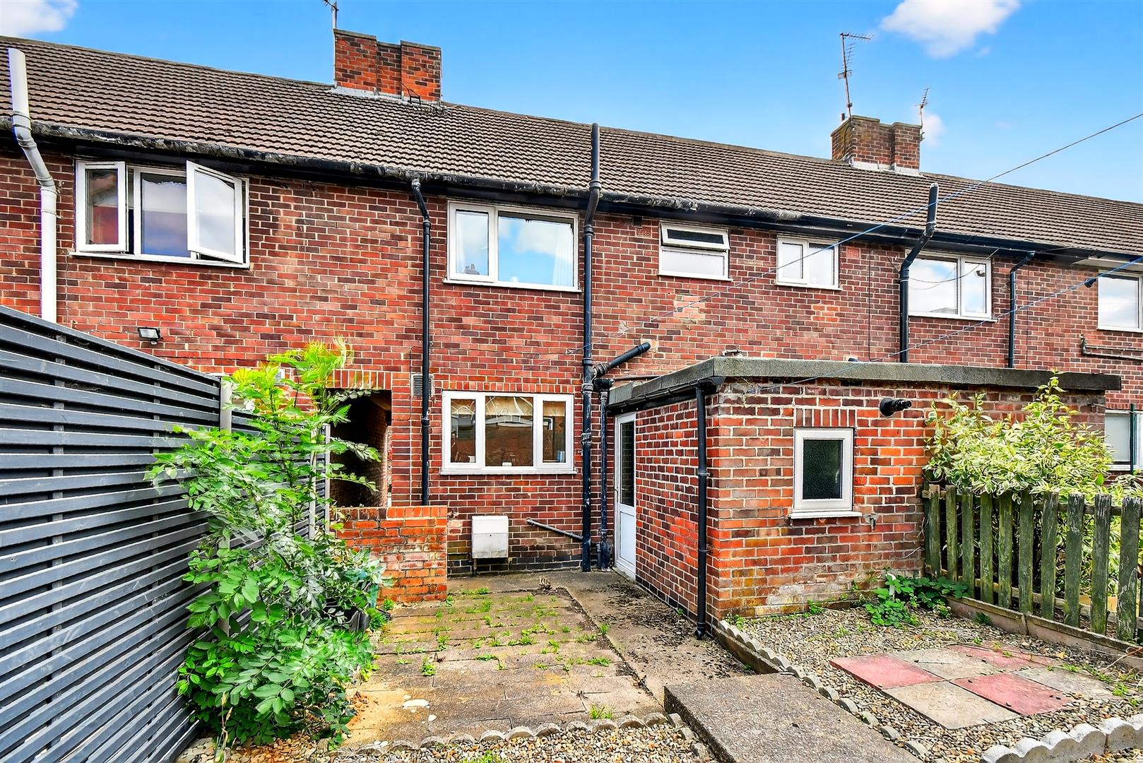 To The Outside - Low maintenance rear courtyard with patio, fence and brick boundary, leading to alleyway