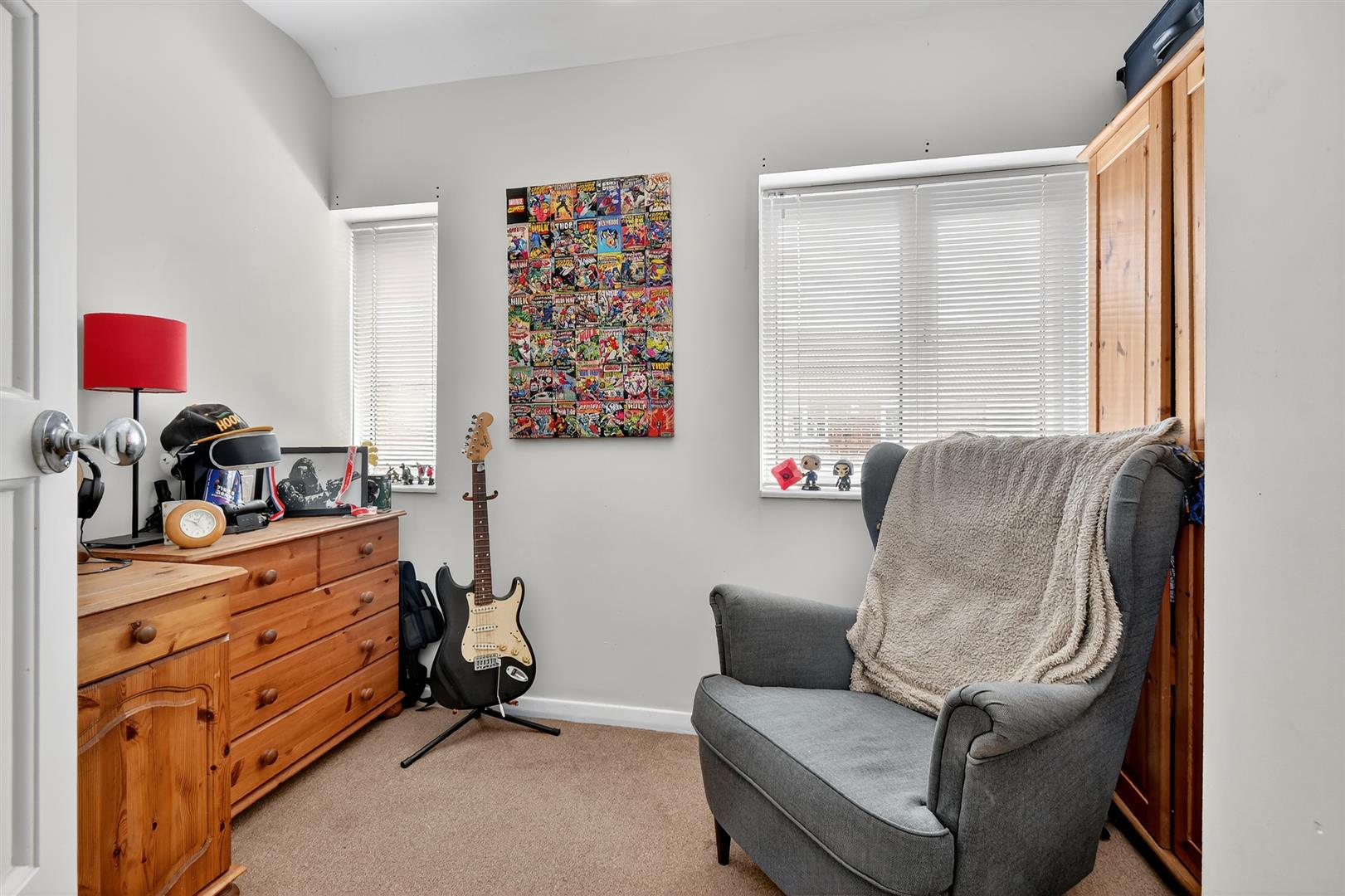 Bedroom 3 - Two windows to front, carpets, power points, storage cupboard