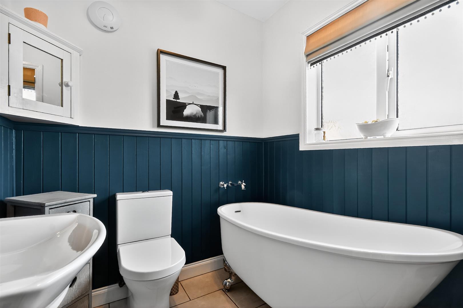 House Bathroom - Opaque window to rear, roll top bath, wash hand basin, low level w.c., column radiator, tiled flooring, extractor fan