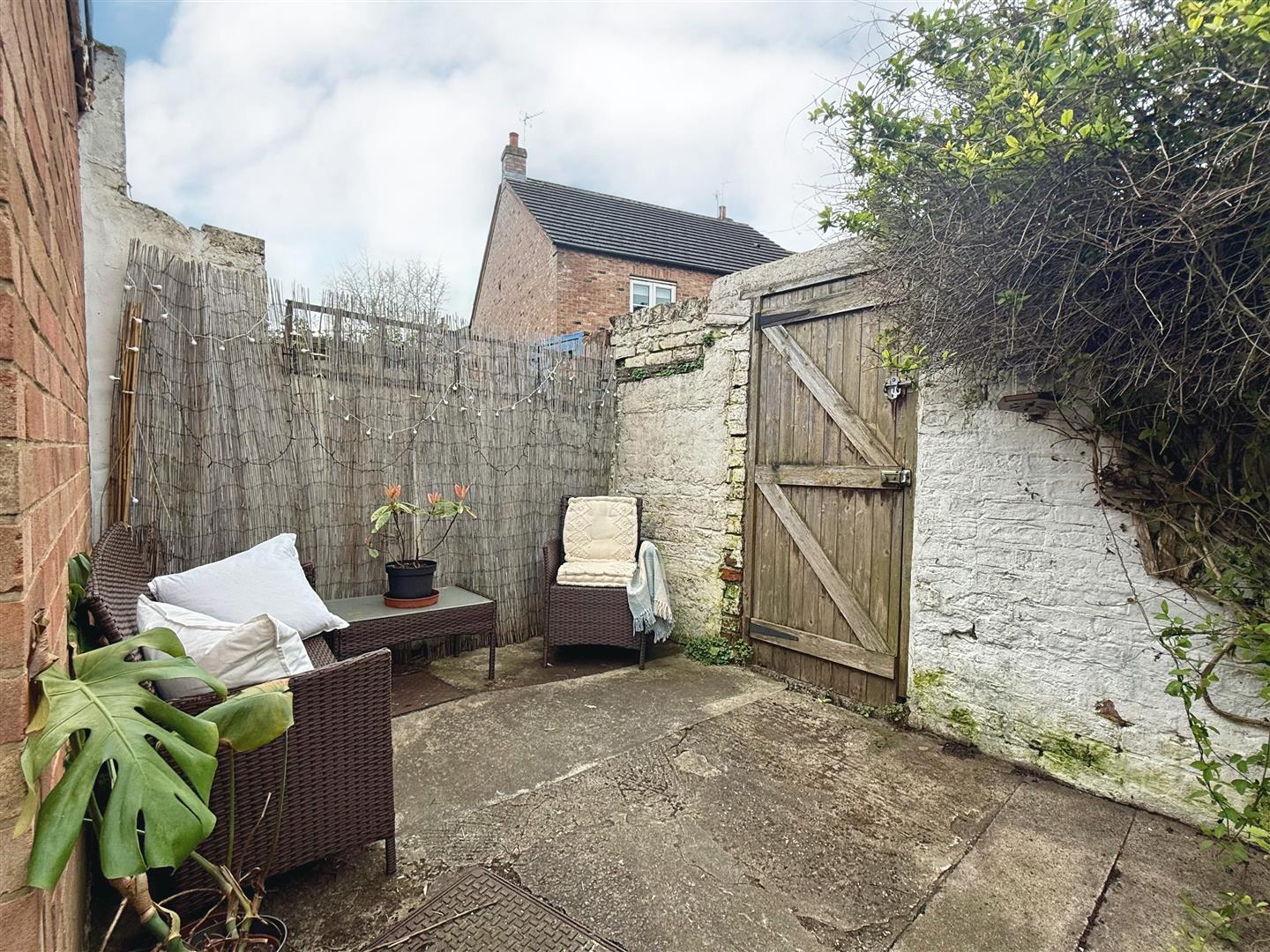 Outside - Rear walled paved courtyard, flower borders, brick boundary wall, gate to service alleyway