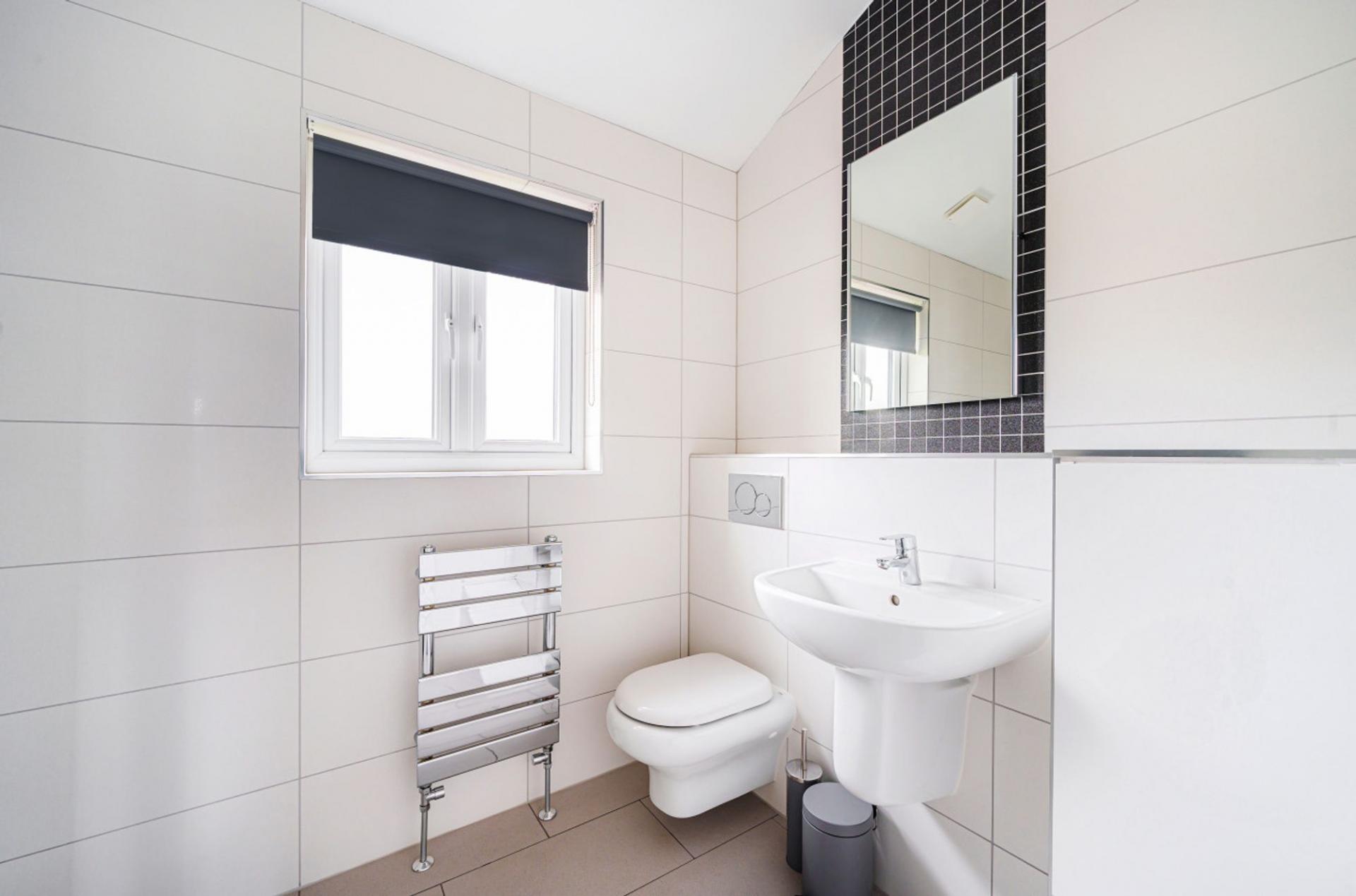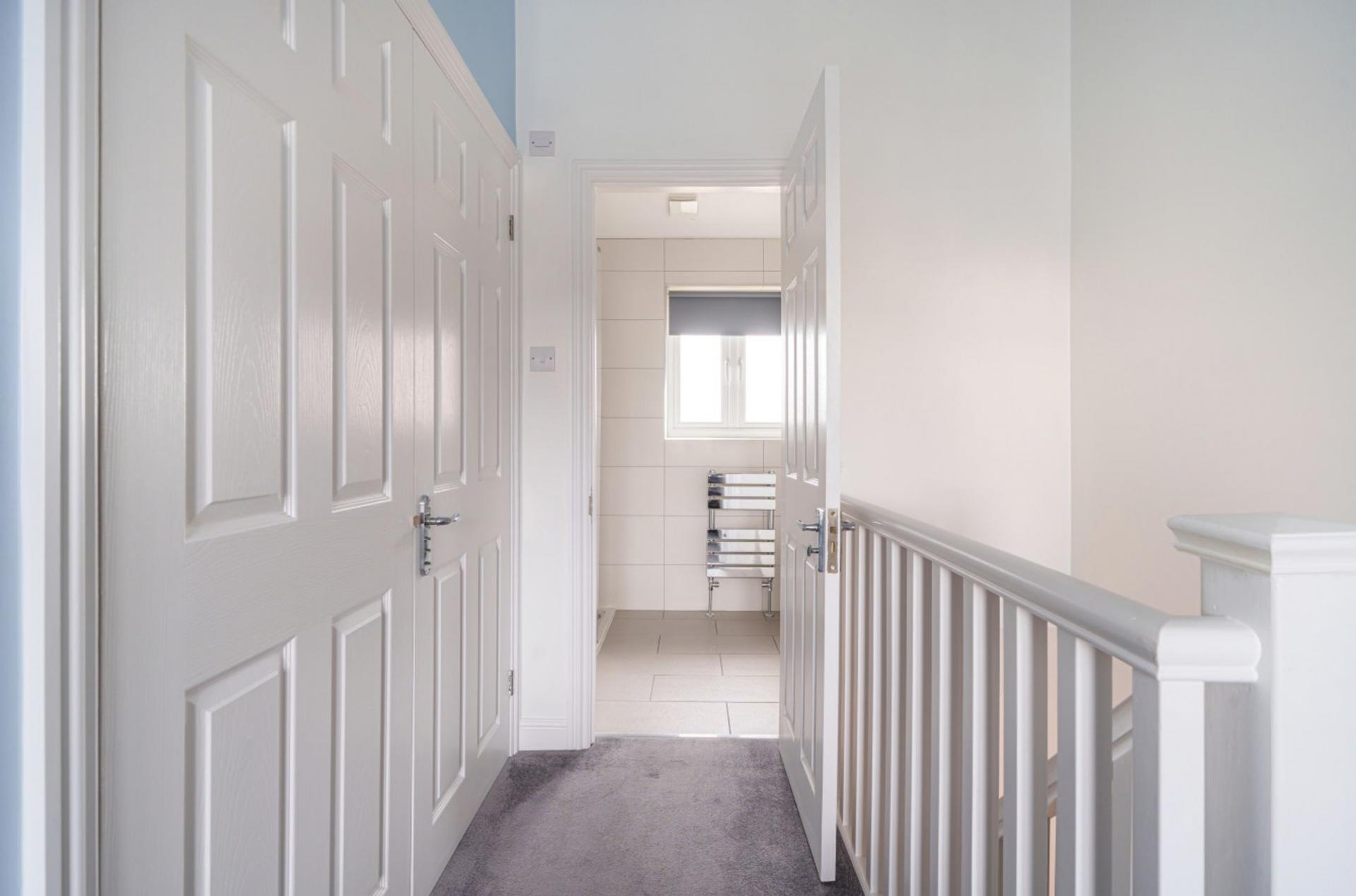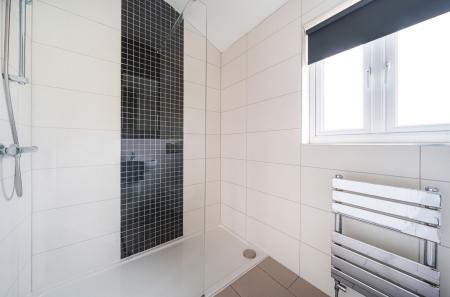 - First floor double bedroom with built-in wardrobe cupboards and shower room with contemporary white suite