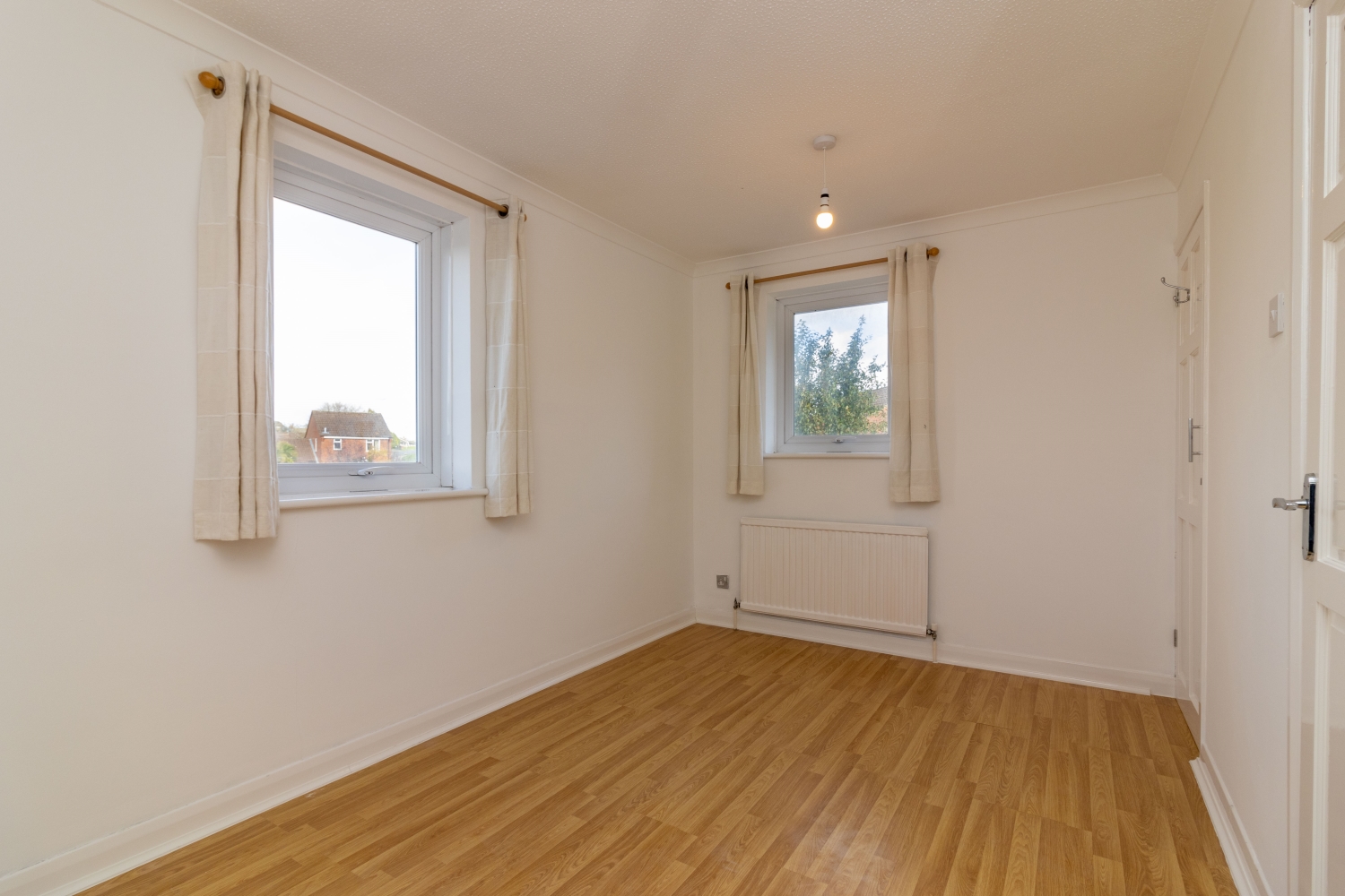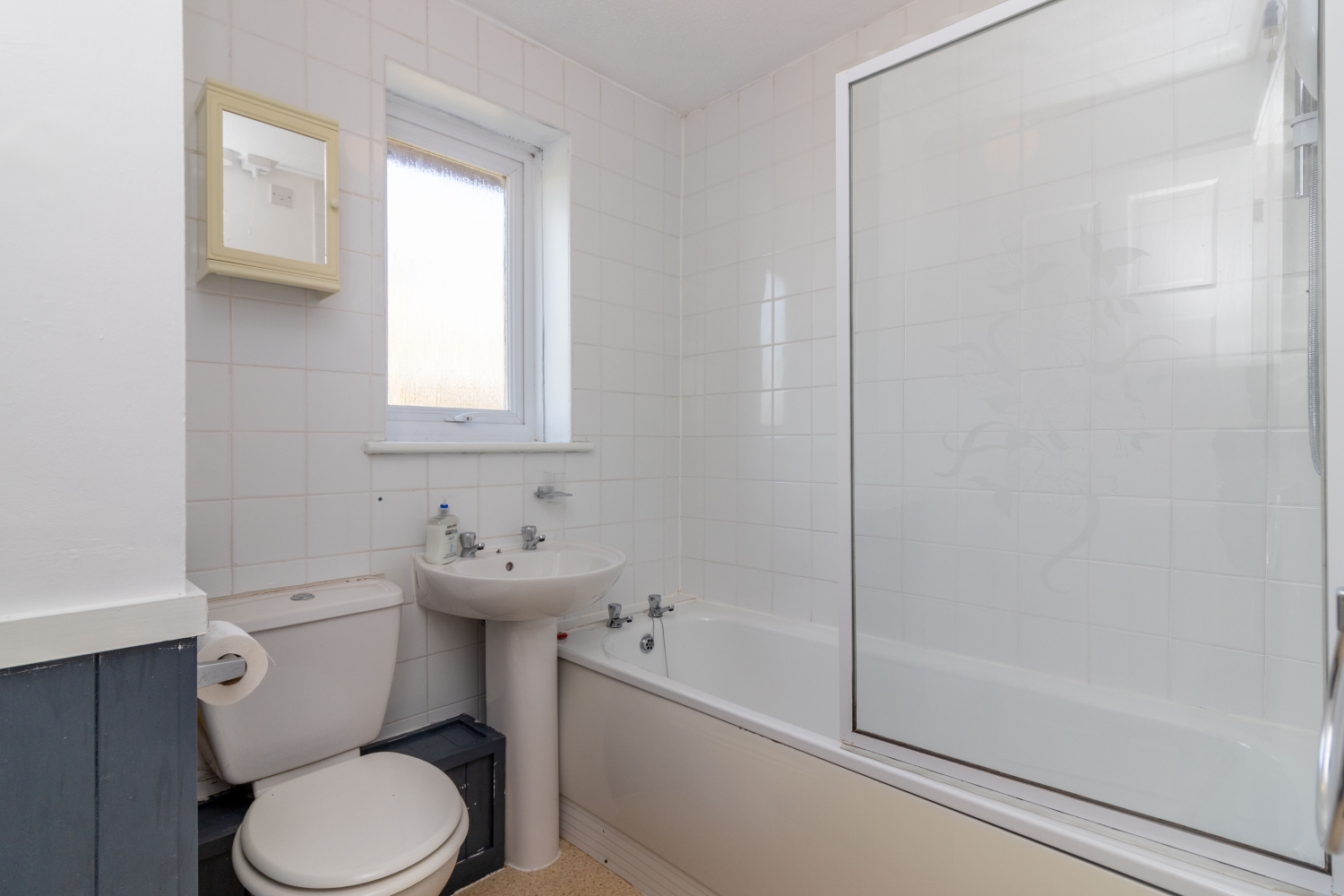 Upstairs is the main bedroom, which is dual aspect and with a built-in wardrobe. The bathroom has a white suite, with shower over the bath.