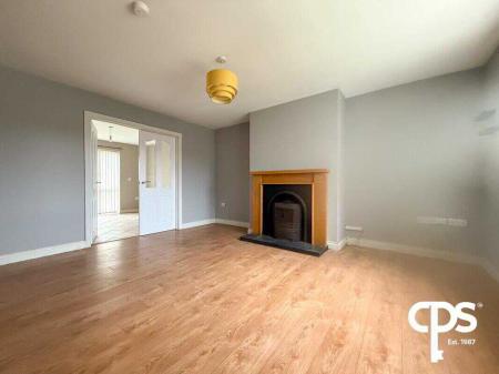 A bright and welcoming front-facing living room featuring wooden flooring, a fireplace with wooden surround, and ample space for comfortable everyday living.