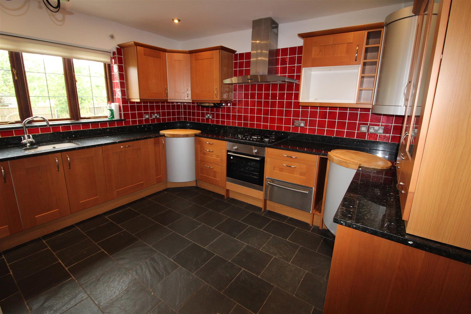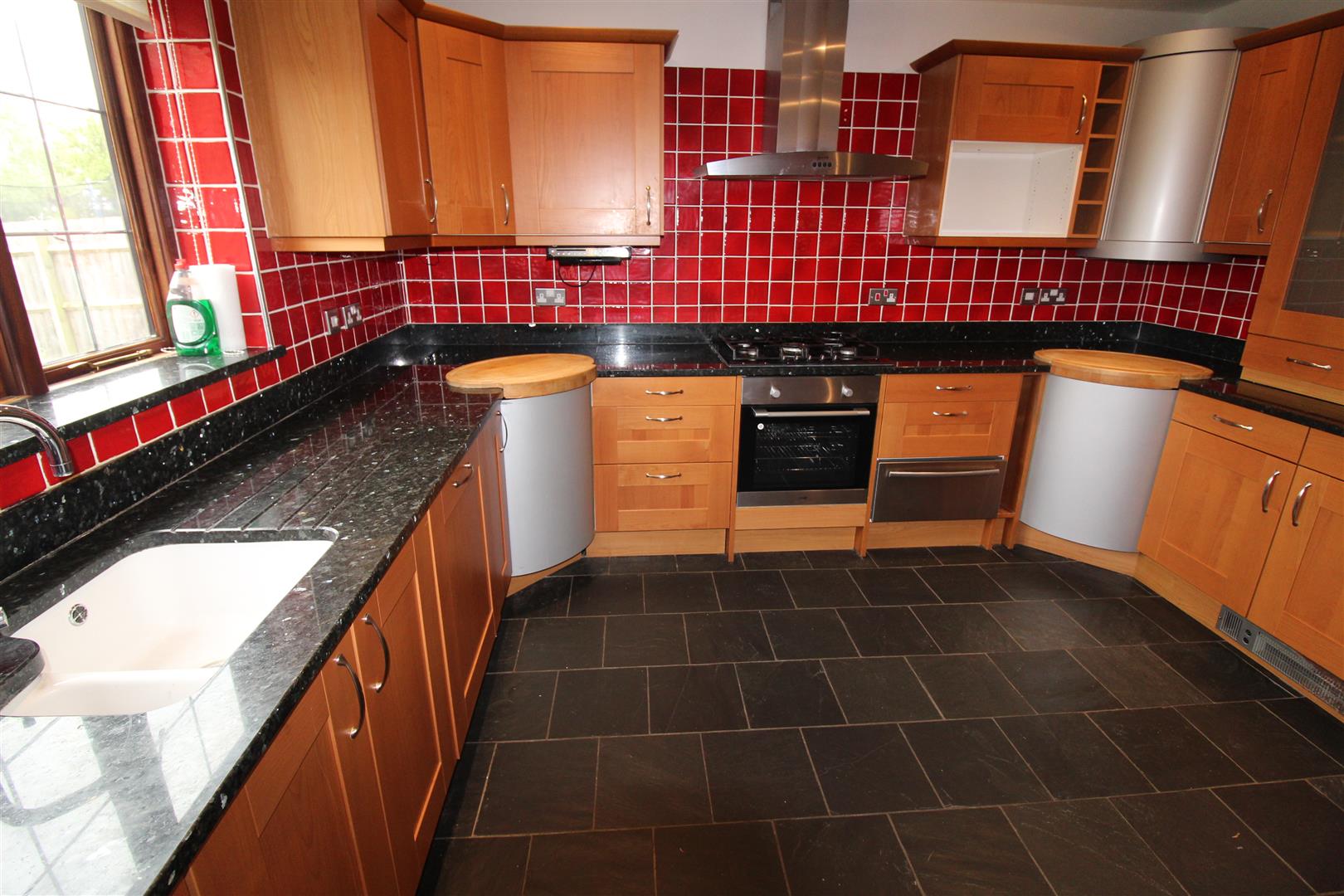 Kitchen/Breakfast Room - 3.73m x 3.61m (12'3" x 11'10") - Range of fitted base and wall units. Solid quartz work surfaces with complementary tiled splash backs. Inset butler sink and moulded drainer. Fitted base electric oven and five ring gas hob with stainless steel extractor hood over. Freestanding upright fridge/freezer. Walk in larder cupboard. Slate tiled flooring with under floor heating. Double glazed window to the rear aspect. Glazed door to:-