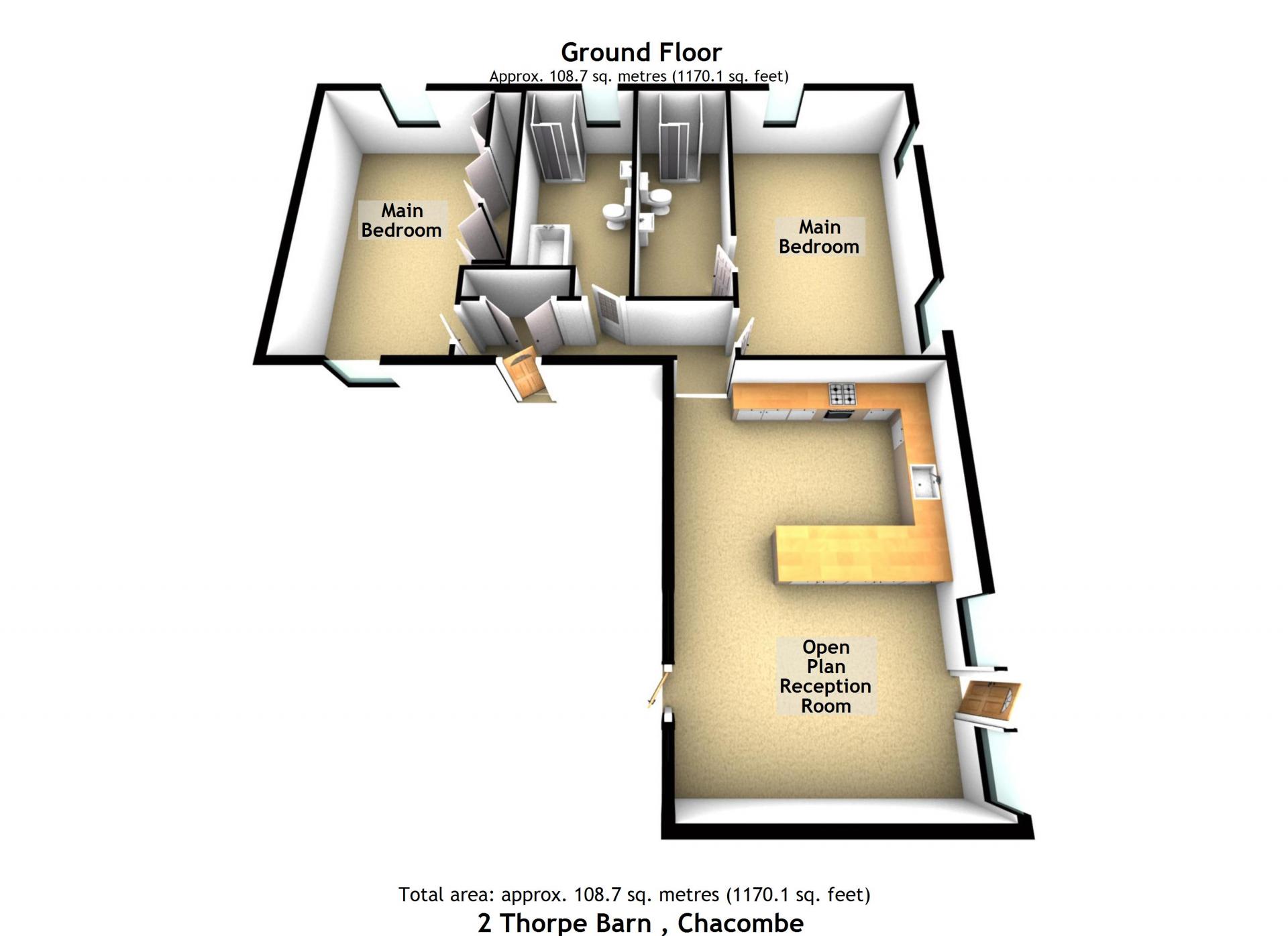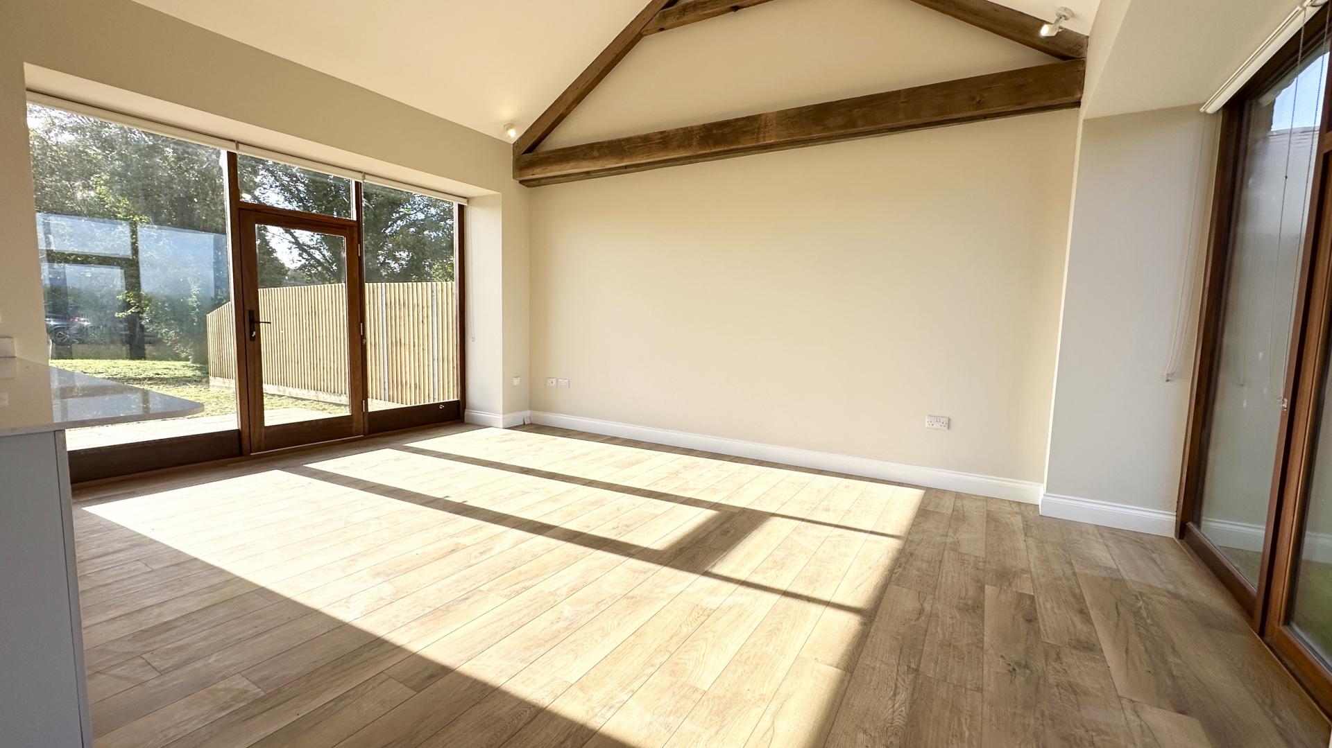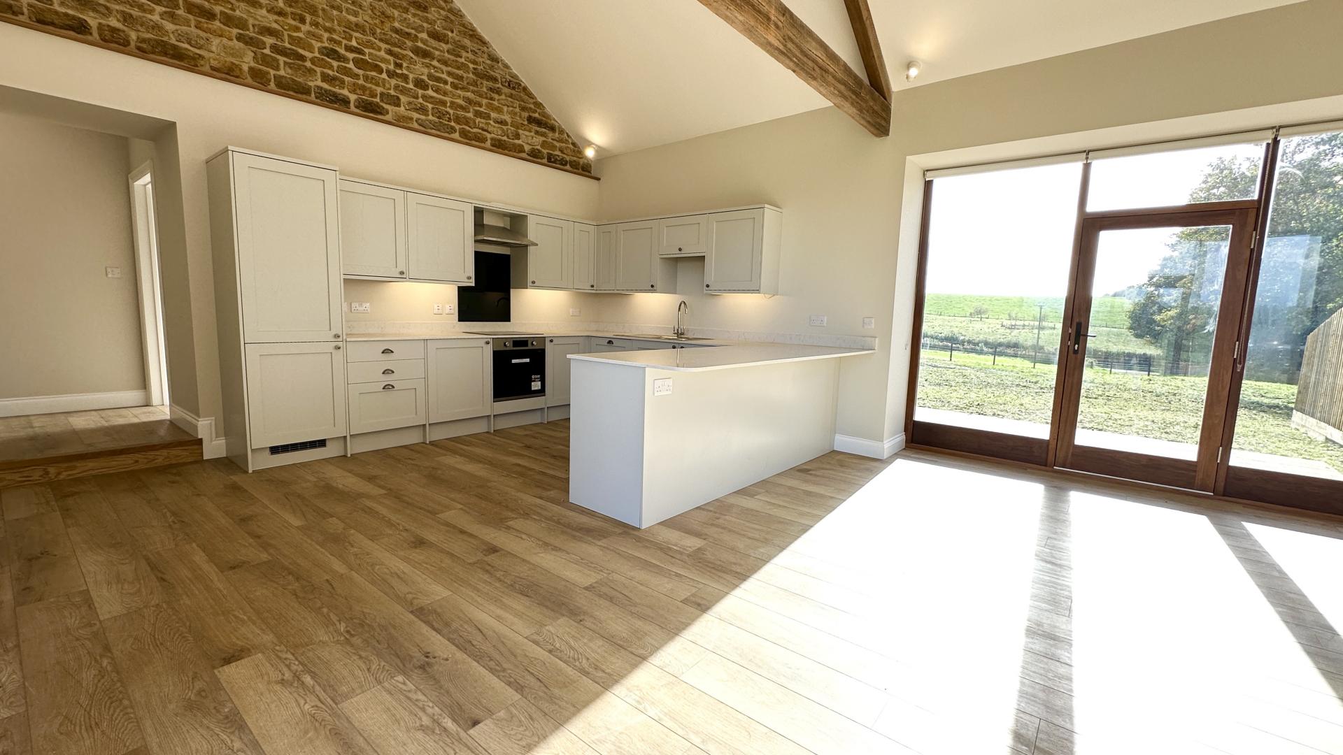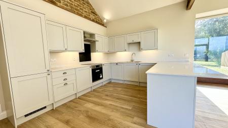 The entrance hall provides access to all principal rooms. The impressive open plan reception area features a vaulted ceiling, exposed timbers, and casement doors, and includes a modern, fully fitted kitchen with integrated appliances.
